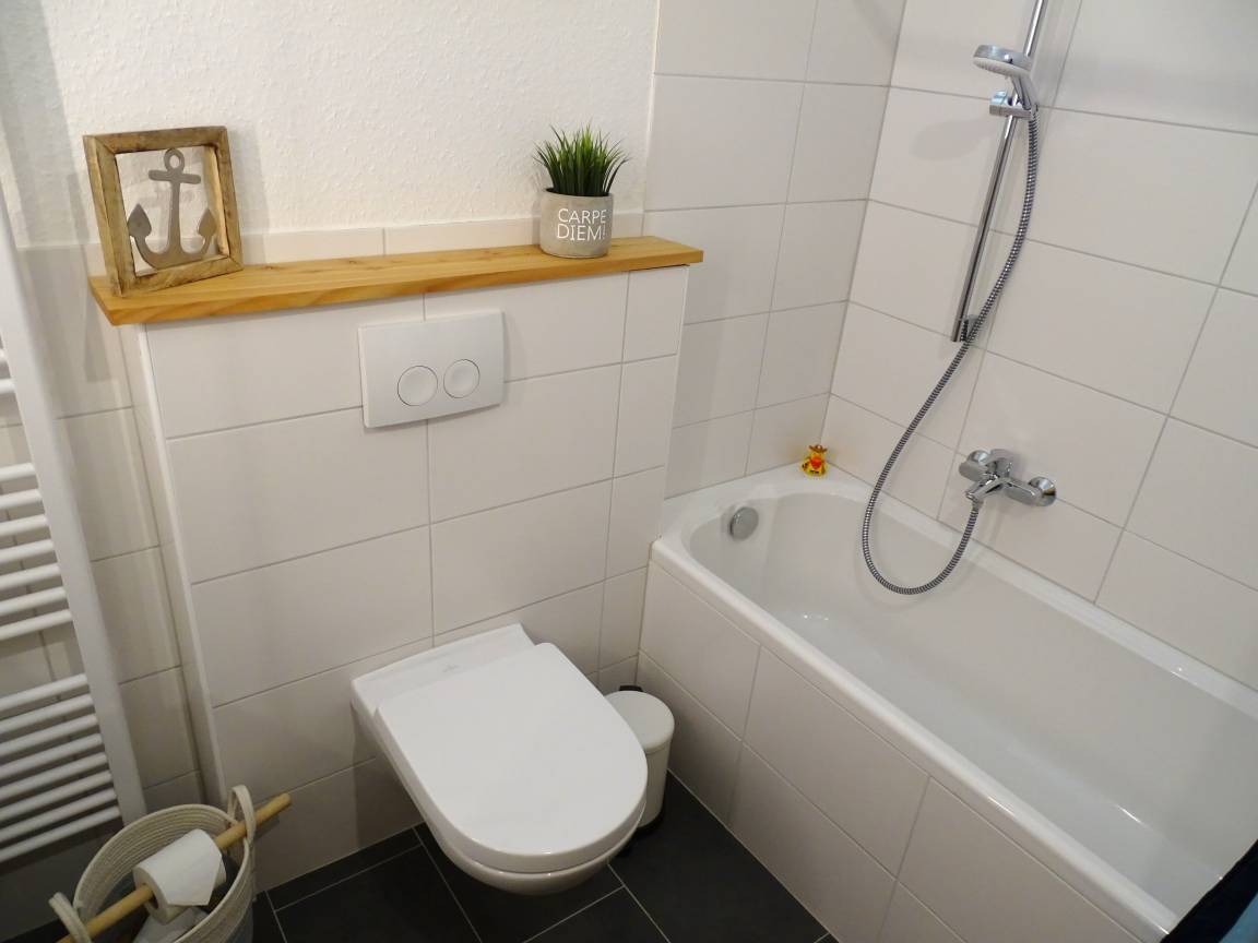 Eines der zwei Bäder verfügt über eine Badewanne das andere Badezimmer verfügt über eine Dusche.