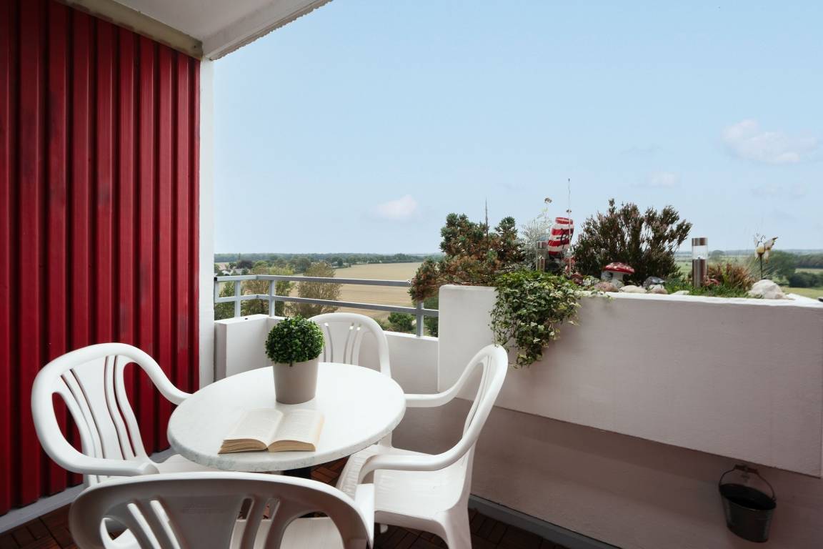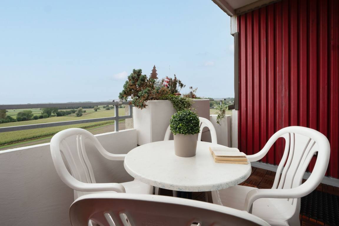 „In dieser Wohnung hat man eine wunderschönen Blick auf das Hinterland (Naturschutzgebiet und Weideflächen). Spät nachmittags/abends Sonne auf dem Balkon.“