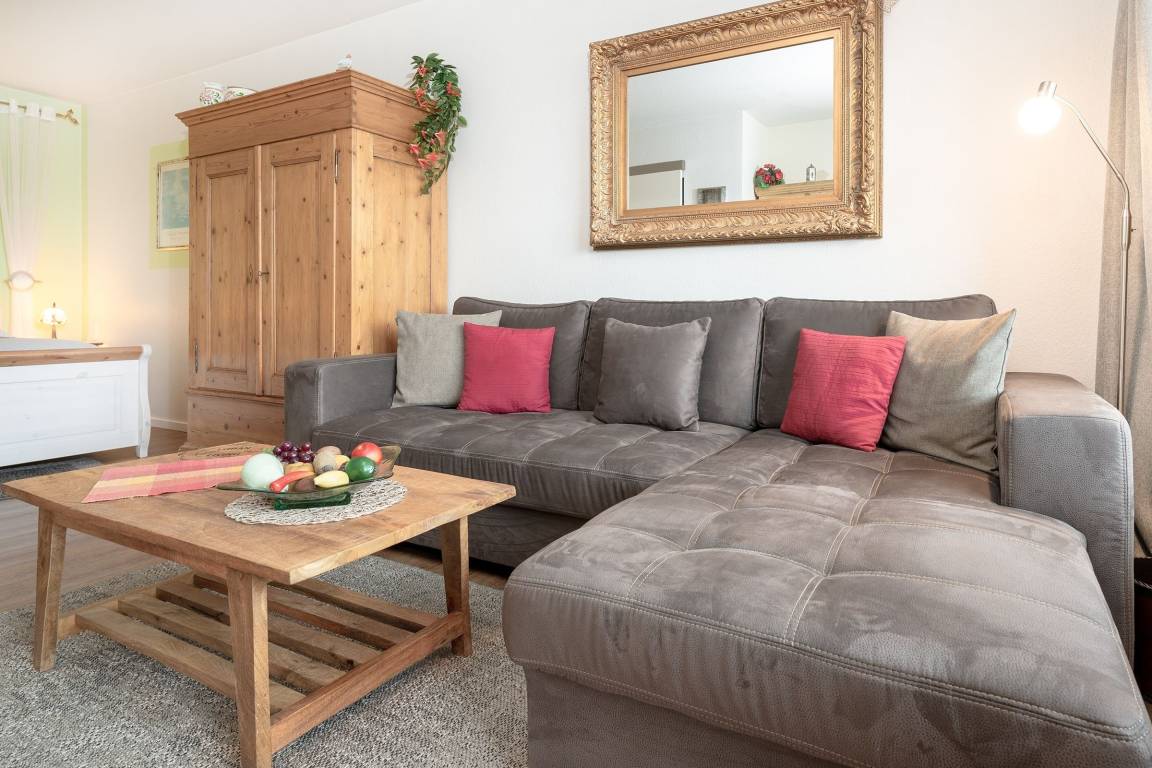 Ihr 46 m² großes Urlaubsdomizil ist angenehm und geschmackvoll eingerichtet und für max. 4 Personen geeignet. Die Wohnung verfügt über einen kombinierten Wohn- und Schlafraum, einen kostenlosen WLAN-Anschluss sowie eine komplett ausgestattete Küche und ein Bad. Den Blick haben Sie zur Landseite, den Balkon zum Westen mit Nachmittags- und Abendsonne.