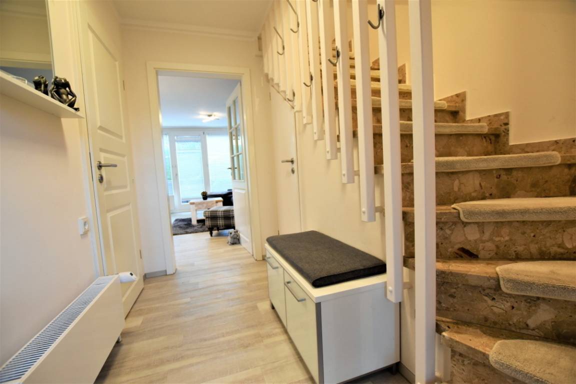Vom Flur aus gelangen Sie geradezu in den modernen Wohnbereich, wo Sie es sich vor dem Fernseher auf der Couch oder dem Sessel gemütlich machen können. Am angrenzenden Esstisch finden bequem 3 Personen zum Essen oder Spielen Platz. Vom Wohnzimmer aus gelangen Sie auch auf die sichtgeschützte Terrasse, die mit Strandkorb und Gartenmöbeln ausgestattet ist und zu traumhaften Stunden im Freien einlädt. Ihre Mahlzeiten können Sie in der voll ausgestatteten Küche zubereiten, hier fehlt es wirklich an nichts und Kaffeeliebhaber können sich sogar auf eine Nespresso-Maschine freuen.
