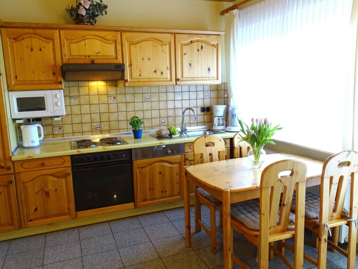 Die 3- Zimmer Ferienwohnung befindet sich im Erdgeschoss des Hauses. Aufgeteilt ist sie in: 2 komplett eingerichtete Schlafzimmer mit Doppelbetten und verstellbaren Gesundheitsrahmen und Federkernauflage. Gemütliches Wohnzimmer mit Sitzgruppe, Eßtisch und integrierter Einbauküche mit dem Ausgang zur möbilierten Südterrasse. Einbauküche voll eingerichtet mit Kühlschrank, Geschirr, 4-Plattenherd mit Backofen, Spülmaschine, Toaster, Kaffeemaschine usw.