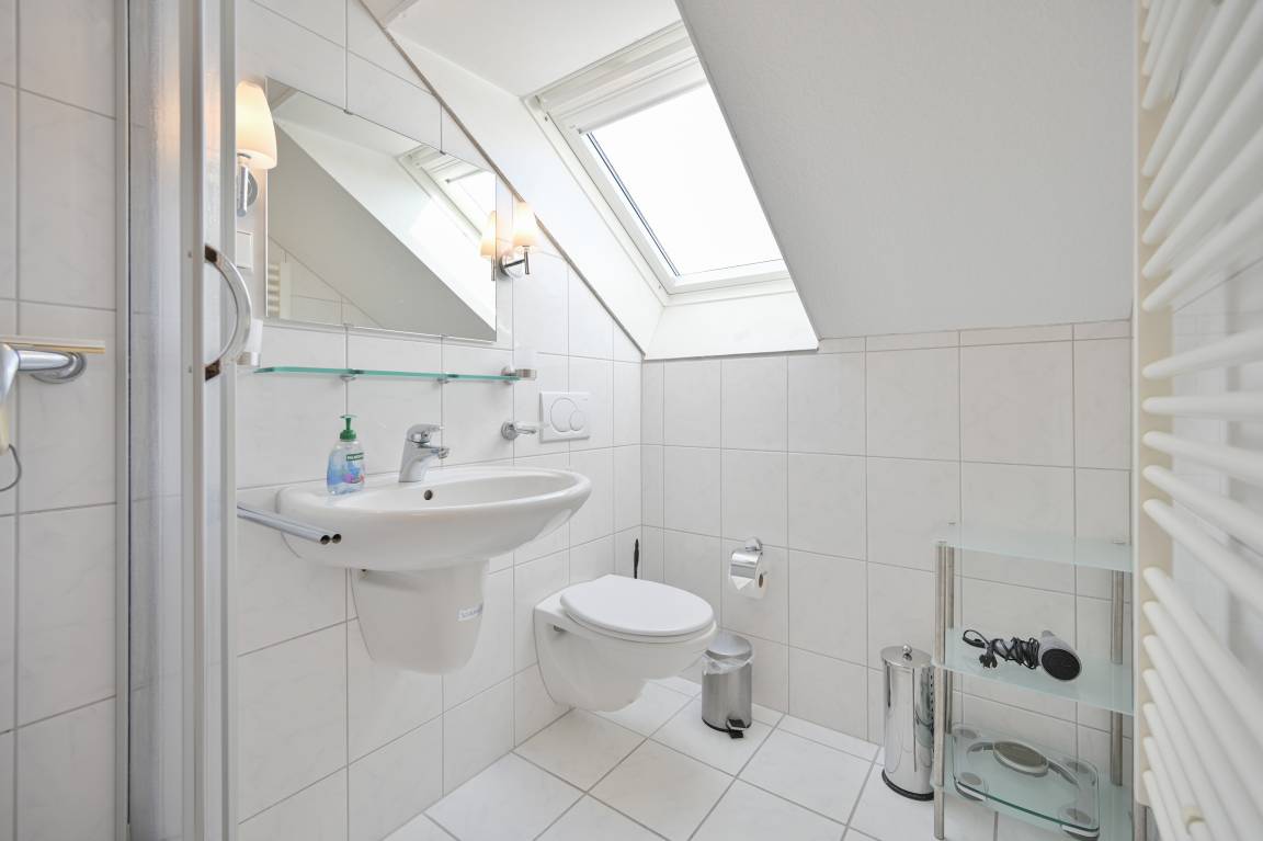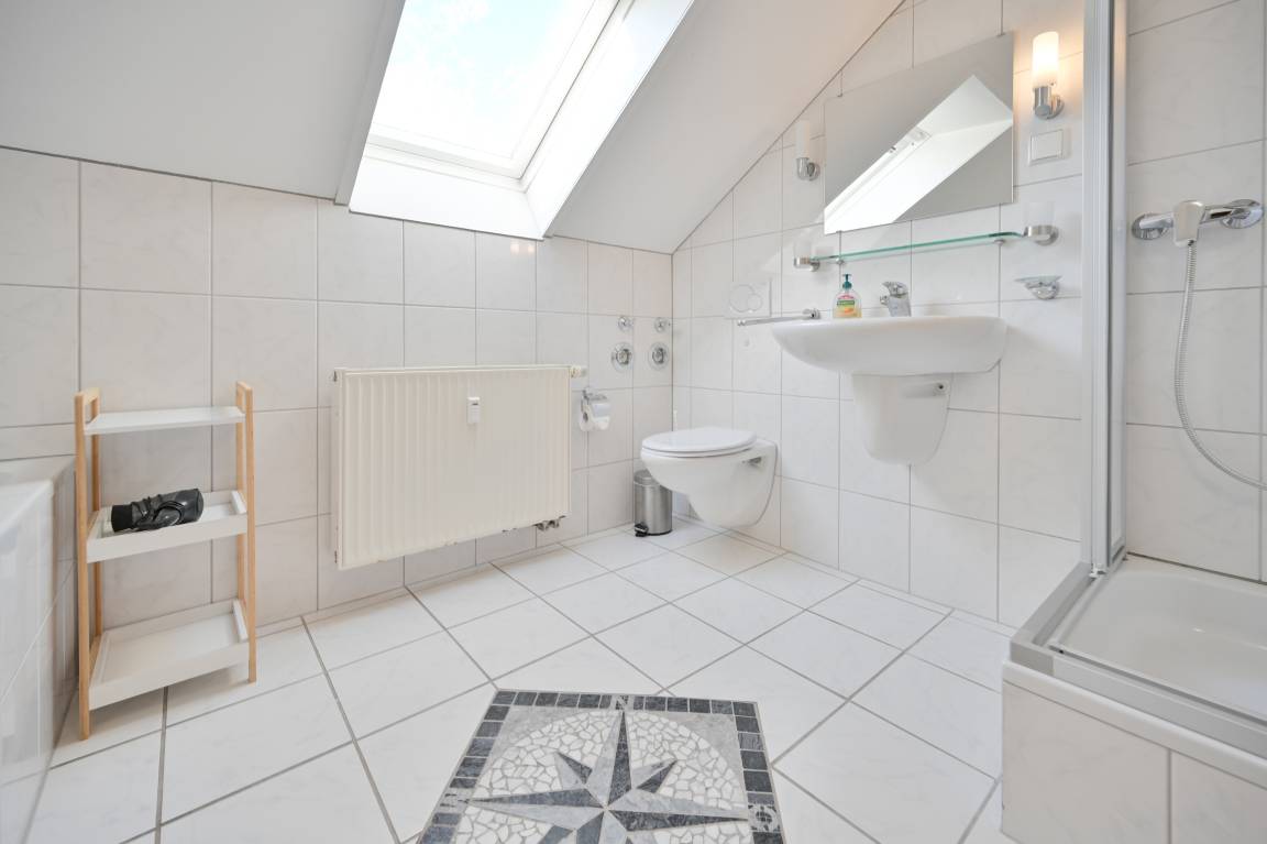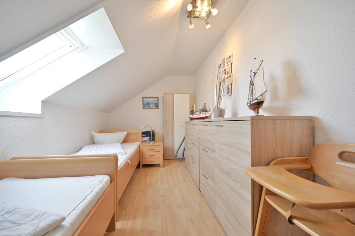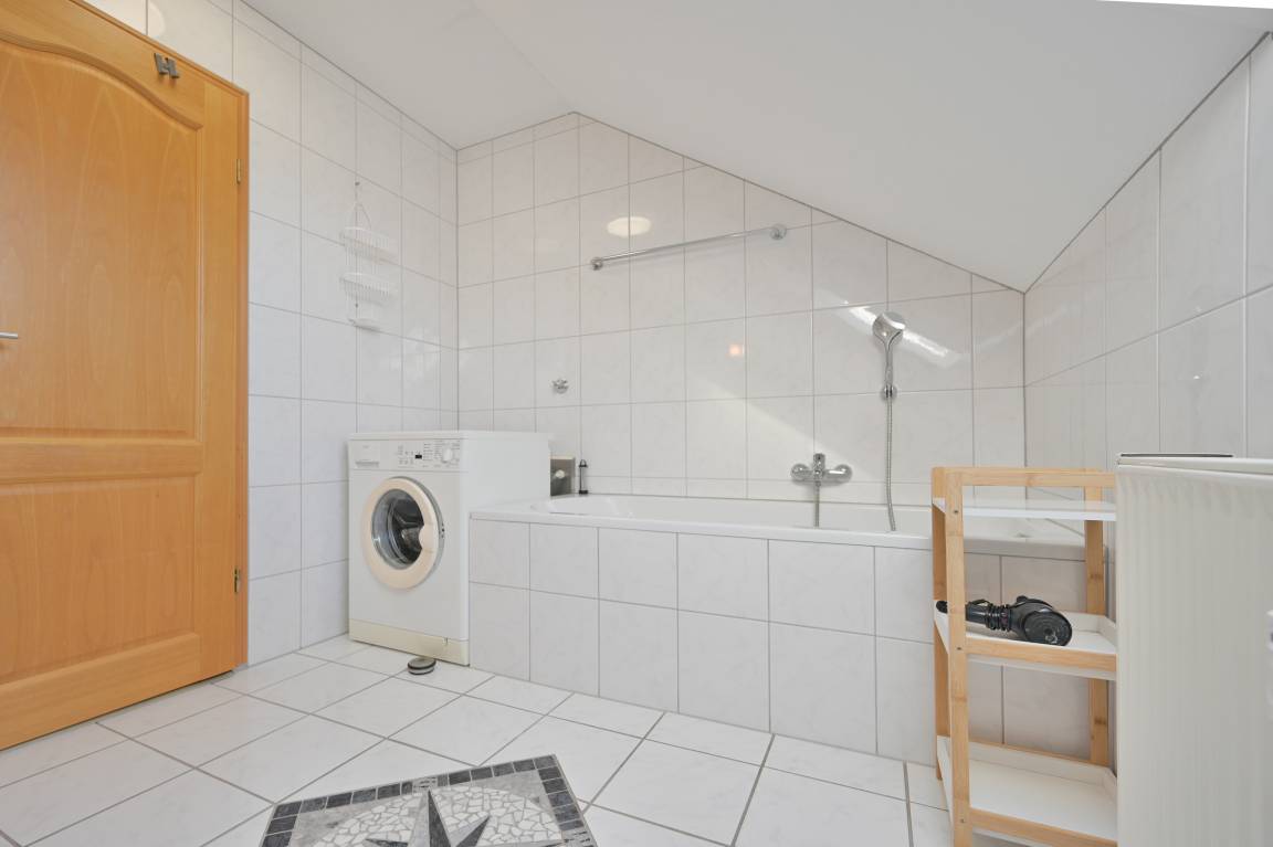 Außerdem gehören zur Ferienwohnung ein separates Schlafzimmer mit Doppelbett (160 x 200) und Kleiderschrank und ein weiteres separates Schlafzimmer mit zwei Einzelbetten (90 x 200) und Kleiderschrank. Darüber hinaus verfügt das Appartement über ein Badezimmer mit Badewanne, Dusche, Waschbecken und Waschmaschine und ein weiteres Bad mit Dusche/WC sowie eine Wohnküche mit Esstisch und 6 Stühlen.