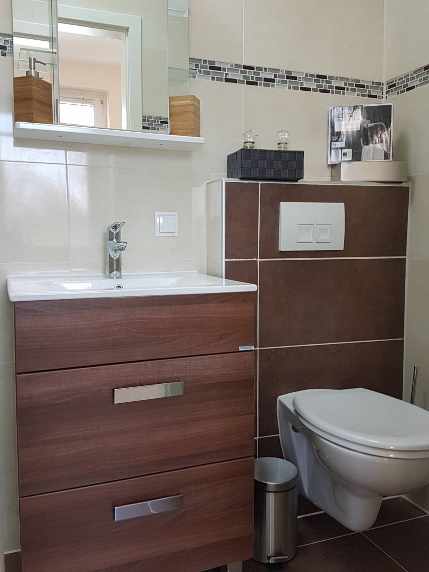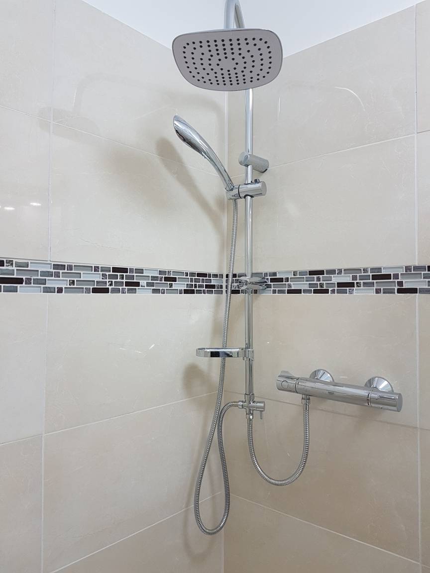 Die modernen Bäder sind mit großen Fliesen in hellbeige Hochglanzoptik und design Bordüre gefließt. Bodentiefe Duschböden und Regenwalddusche sowie Sicherheitsglasduschkabinen vermitteln ein exklusives Ambiente.