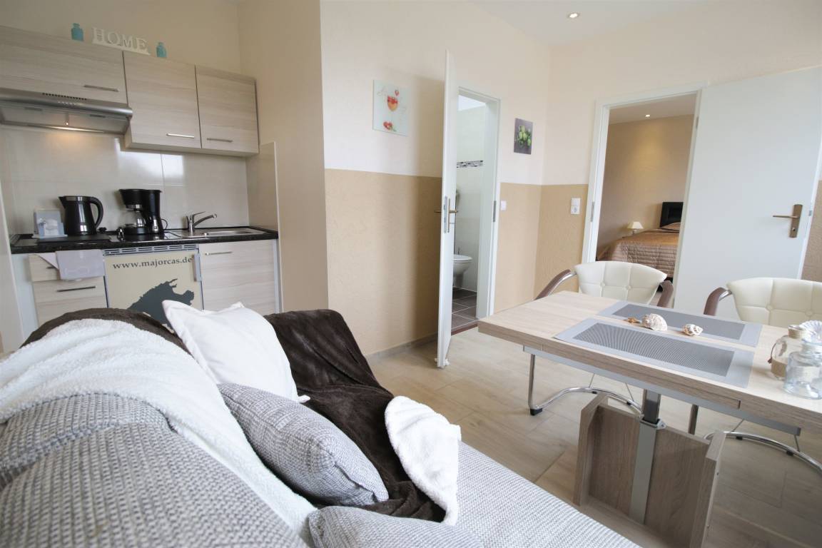 Der Küchenbereich der Wohnungen ist funktionell ausgestattet mit Kühlschrank und doppeltem Cerankochfeld mit Dunstabzugshaube. Kaffeemaschine, Toaster , Eierkocher sowie alle für den täglichen Gebrauch erforderlichen Dinge sind vorhanden.
