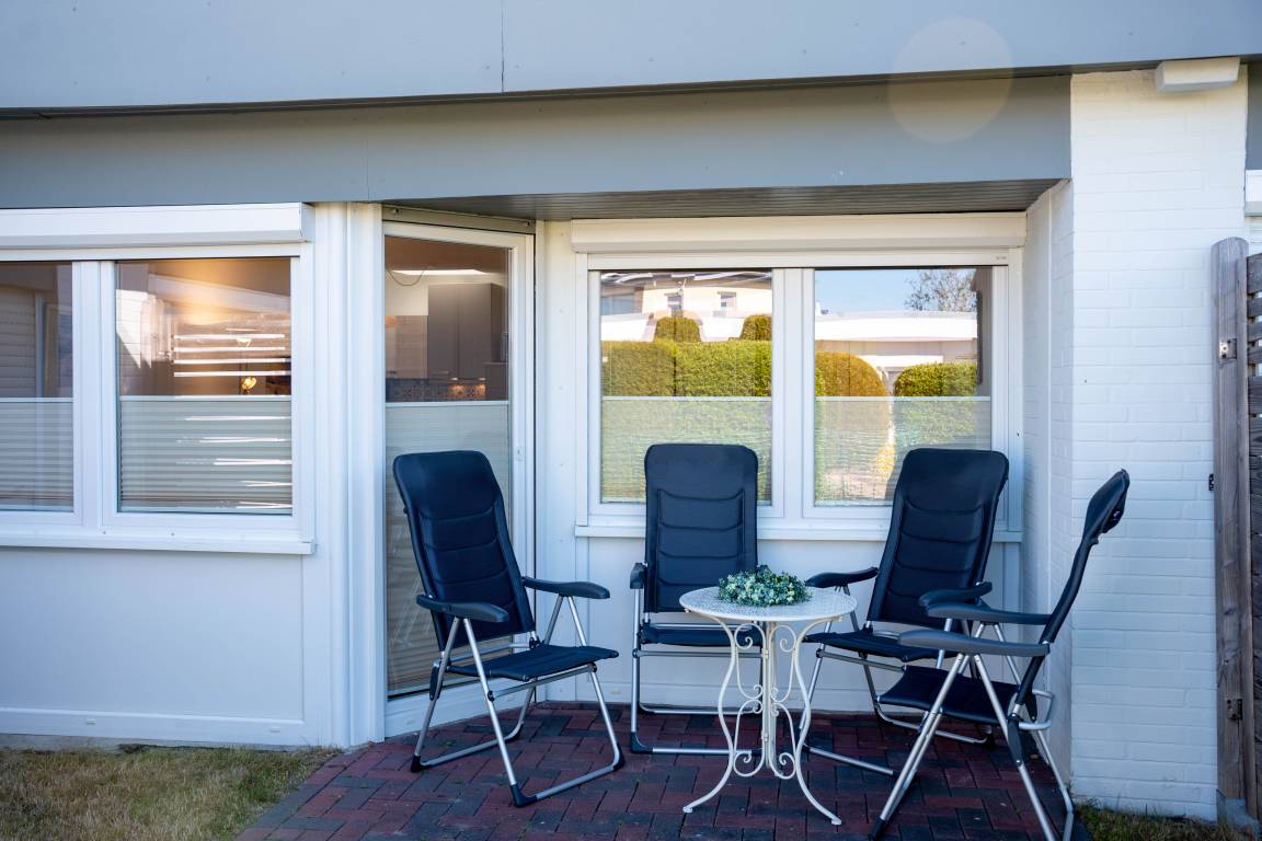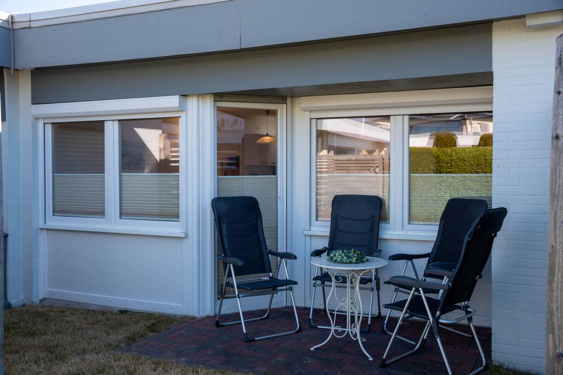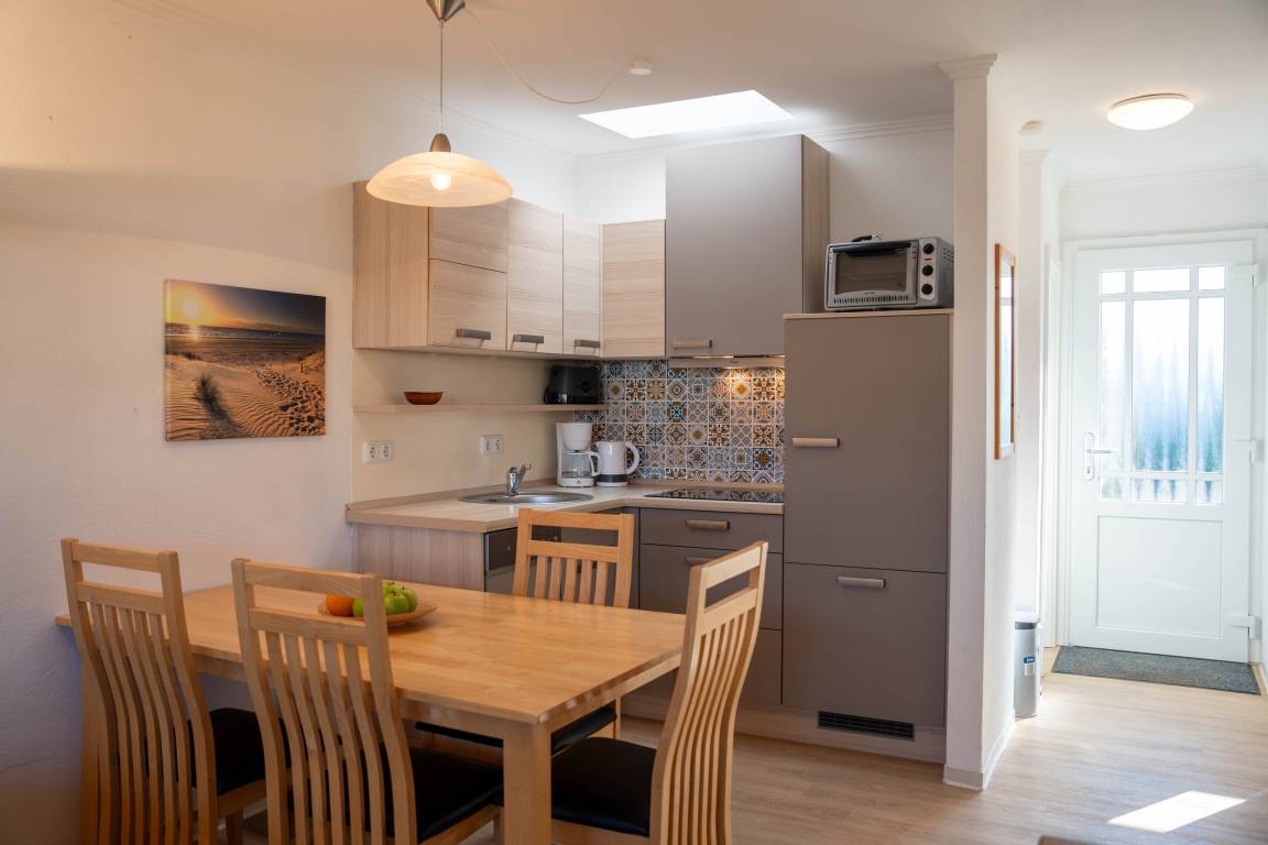 Der Bungalow verfügt über ein Schlafzimmer mit einem Doppelbett (180 x 190 cm) sowie einen separaten Schlafraum mit einem Etagenbett (90 x 190 cm). Die offene Küchenzeile ist mit einem Geschirrspüler ausgestattet. Im Wohnbereich können Sie auf der Couch entspannen. .Die Einrichtung ist funktional, und es gibt eine Sitzecke für bis zu vier Personen, perfekt für gemeinsame Mahlzeiten oder entspannte Abende. Im Außenbereich gibt es eine kleine Terrasse, die ab Juli 2025 eingezäunt sein wird, sodass auch Hunde dort sicher entspannen können.