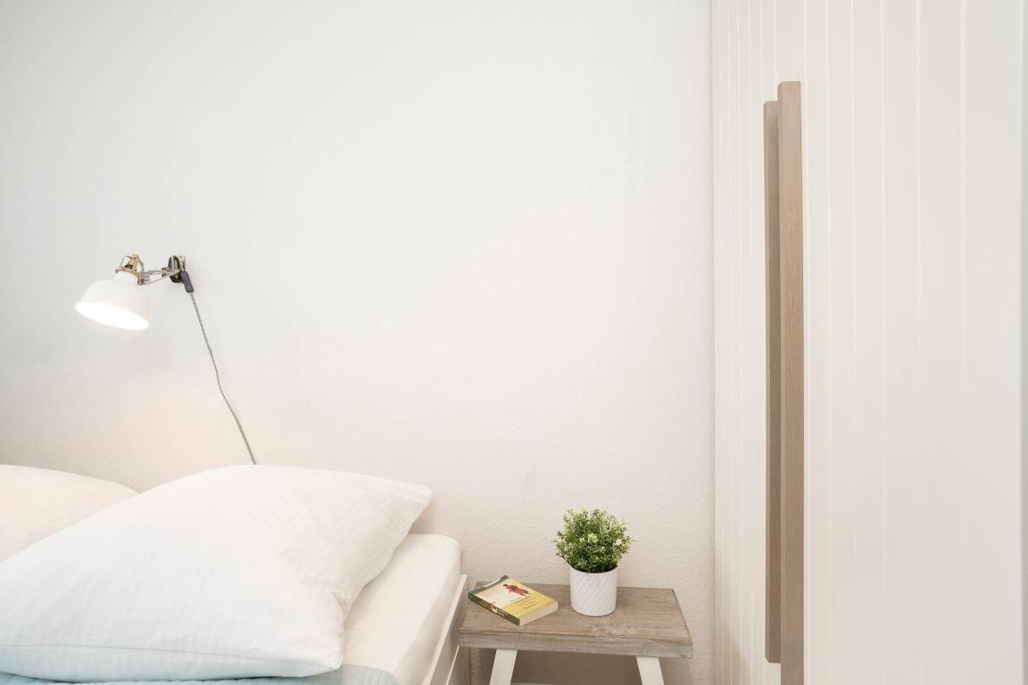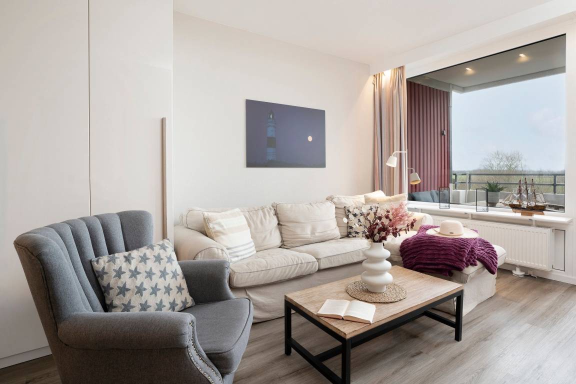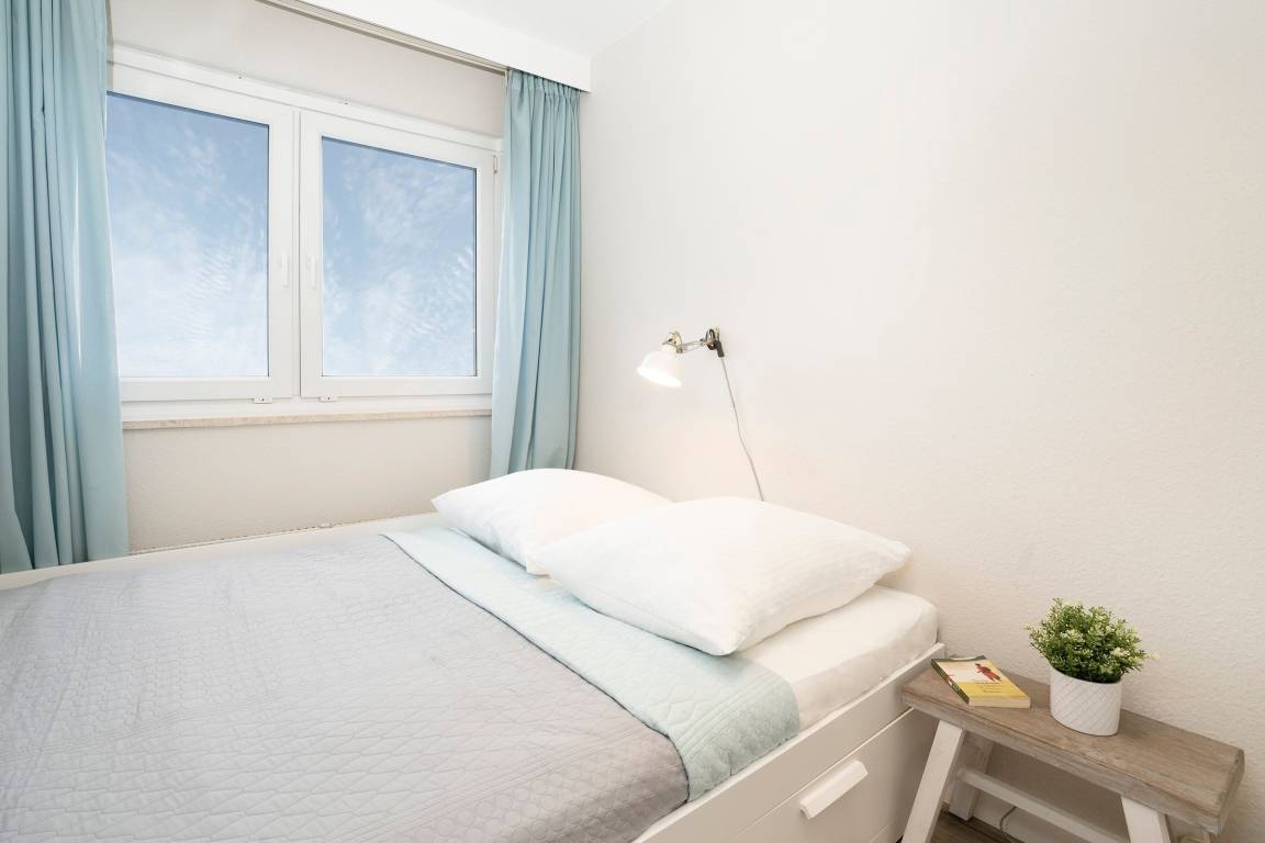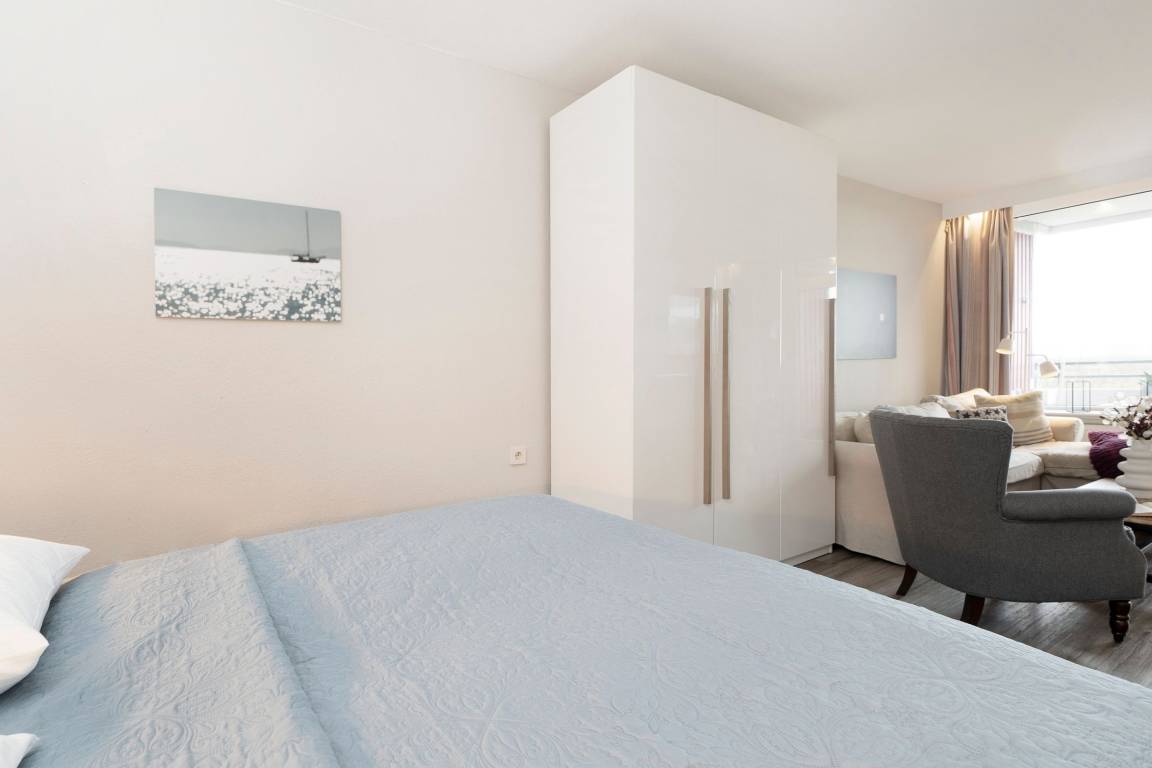 Es erwartet Sie ein heller, kombinierter Wohn- und Schlafraum mit einem komfortablen Boxspring-Doppelbett (180x200 cm, durchgehende Matratze), ein helles Ecksofa sowie ein gemütlicher Sessel. Ihre Urlaubsgarderobe können Sie im Kleiderschrank verstauen und vor dem Flachbildfernseher lassen sich gemütliche Abende verbringen. Im separaten Schlafzimmer erwartet Sie ein Kojenbett (je 80x200 cm) sowie ein weiterer Flachbildfernseher. Die moderne, geschlossene Küche mit Esstisch ist z. B. mit einem Geschirrspüler, einem Kühlschrank sowie einem Backofen in komfortabler Arbeitshöhe sehr gut ausgestattet. Das innenliegende, hell geflieste Badezimmer empfängt Sie mit einer Badewanne. Der WLAN-Anschluss ist selbstverständlich kostenfrei.