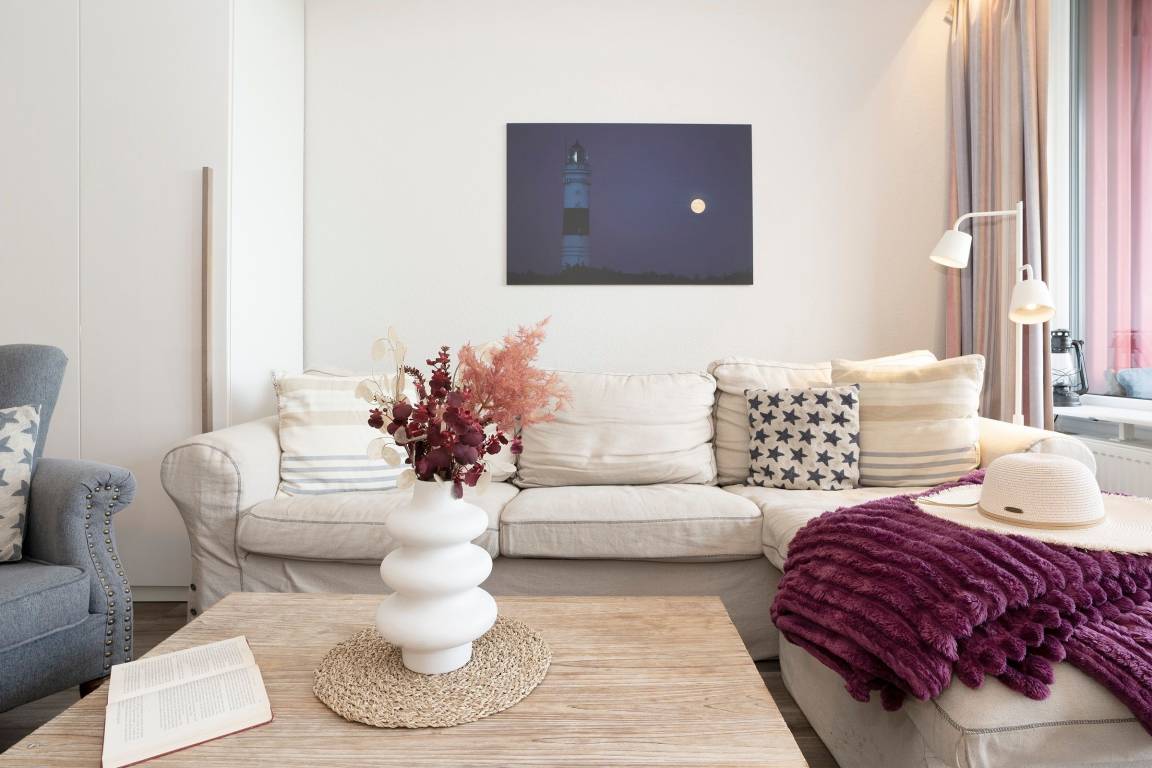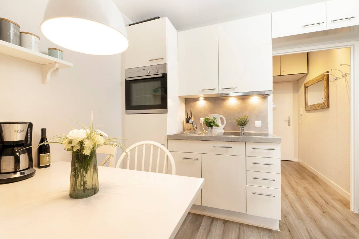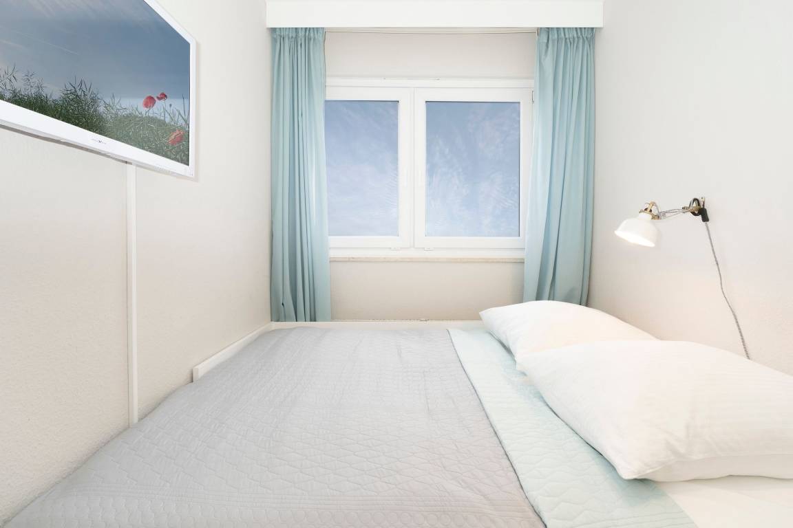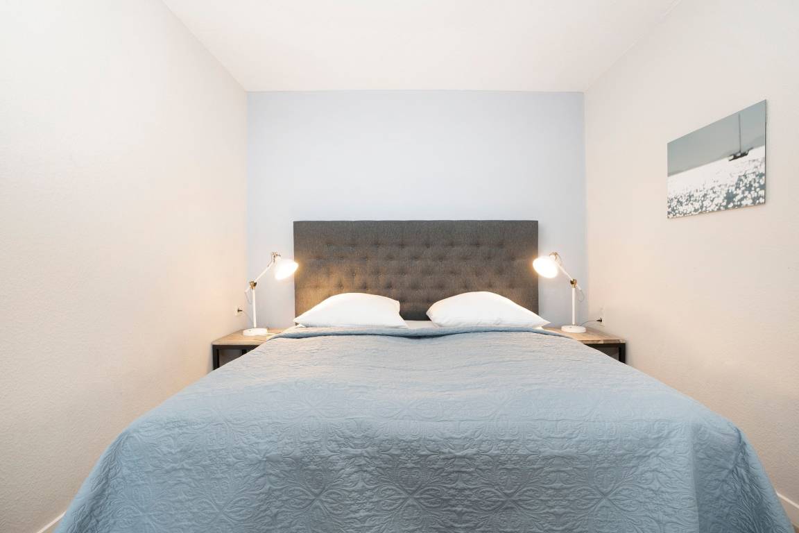 Es erwartet Sie ein heller, kombinierter Wohn- und Schlafraum mit einem komfortablen Boxspring-Doppelbett (180x200 cm, durchgehende Matratze), ein helles Ecksofa sowie ein gemütlicher Sessel. Ihre Urlaubsgarderobe können Sie im Kleiderschrank verstauen und vor dem Flachbildfernseher lassen sich gemütliche Abende verbringen. Im separaten Schlafzimmer erwartet Sie ein Kojenbett (je 80x200 cm) sowie ein weiterer Flachbildfernseher. Die moderne, geschlossene Küche mit Esstisch ist z. B. mit einem Geschirrspüler, einem Kühlschrank sowie einem Backofen in komfortabler Arbeitshöhe sehr gut ausgestattet. Das innenliegende, hell geflieste Badezimmer empfängt Sie mit einer Badewanne. Der WLAN-Anschluss ist selbstverständlich kostenfrei.