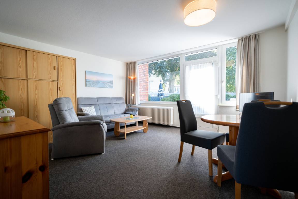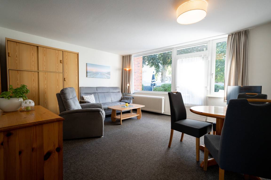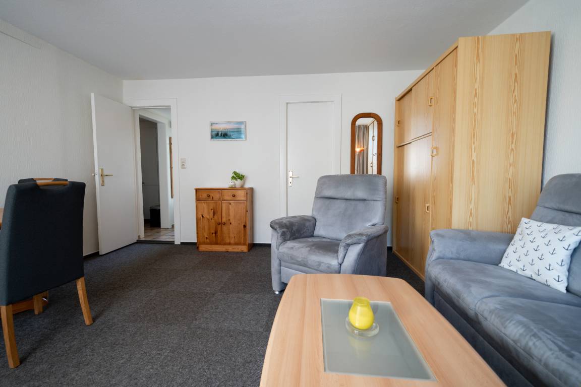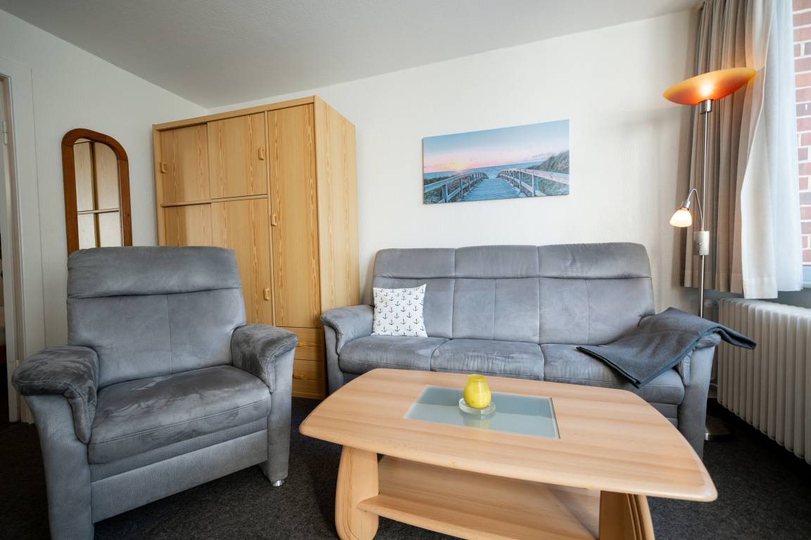 Im Wohnbereich können Sie auf der Couch entspannen. Die Einrichtung ist zweckmäßig und es gibt eine Sitzecke für bis zu 3 Personen.