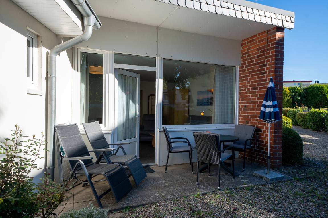 Die an den Wohnbereich angrenzende Terrasse ist mit Gartentisch, Bestuhlung und Sonnenschirm ausgestattet.