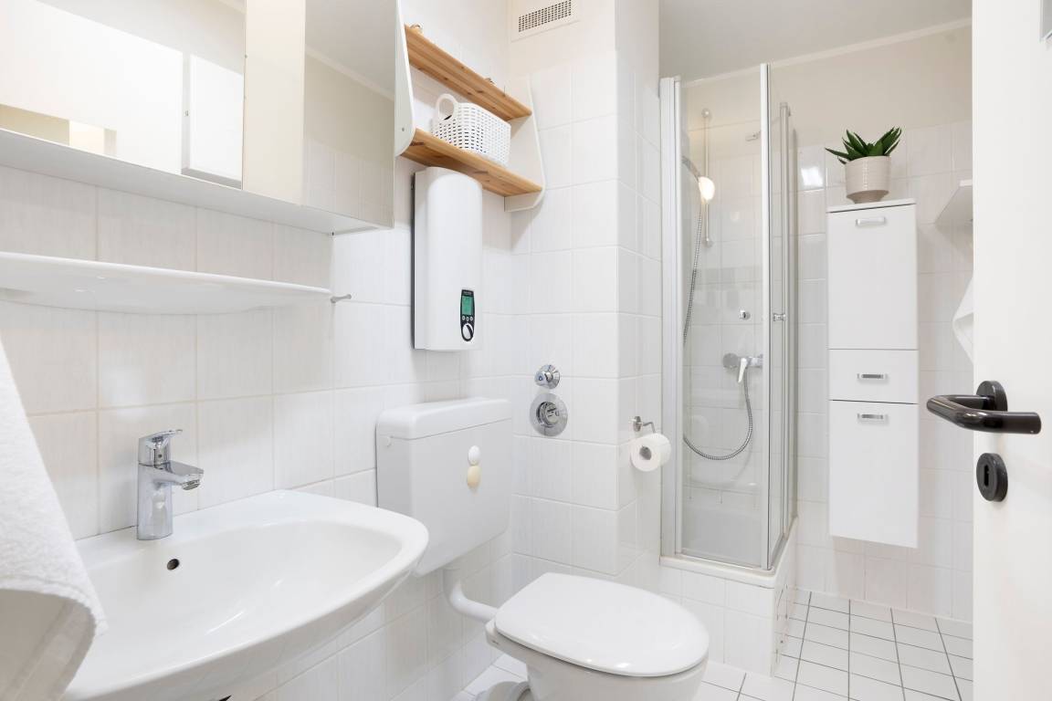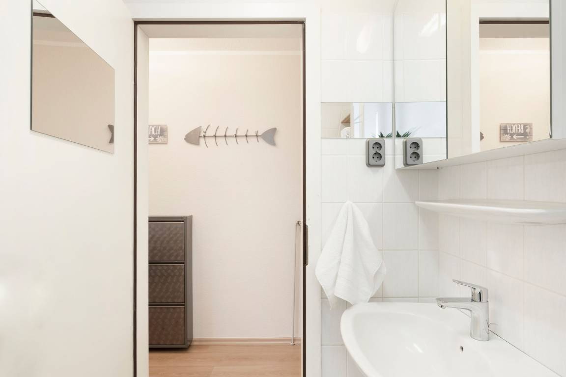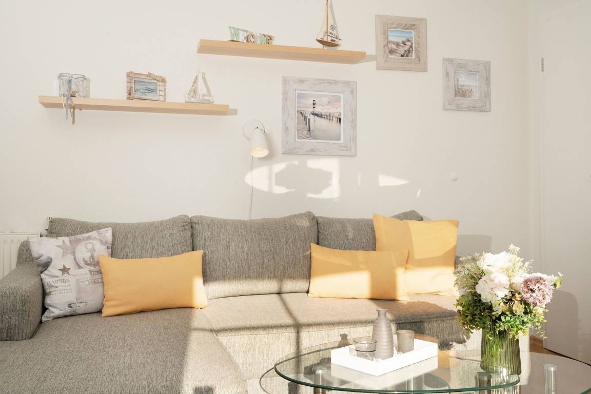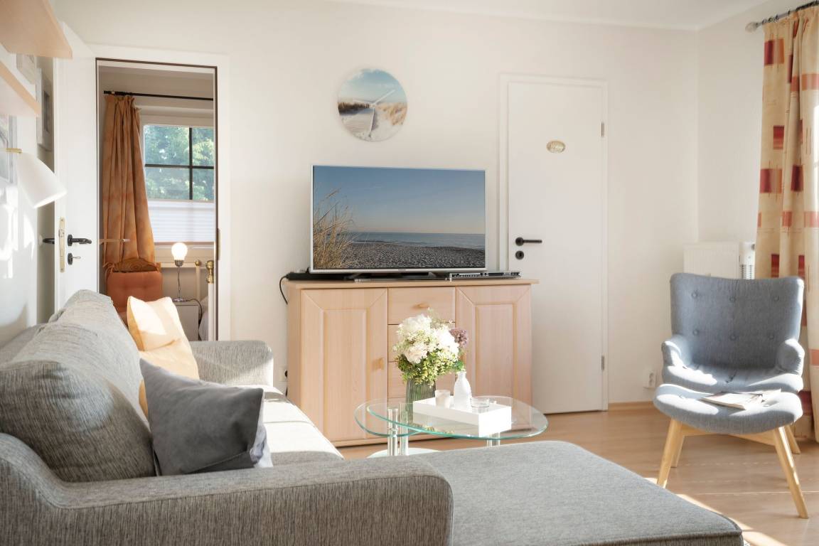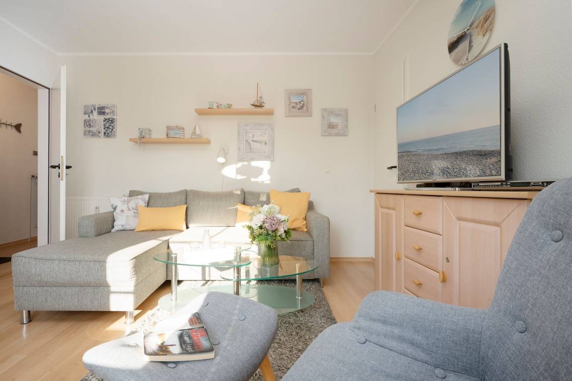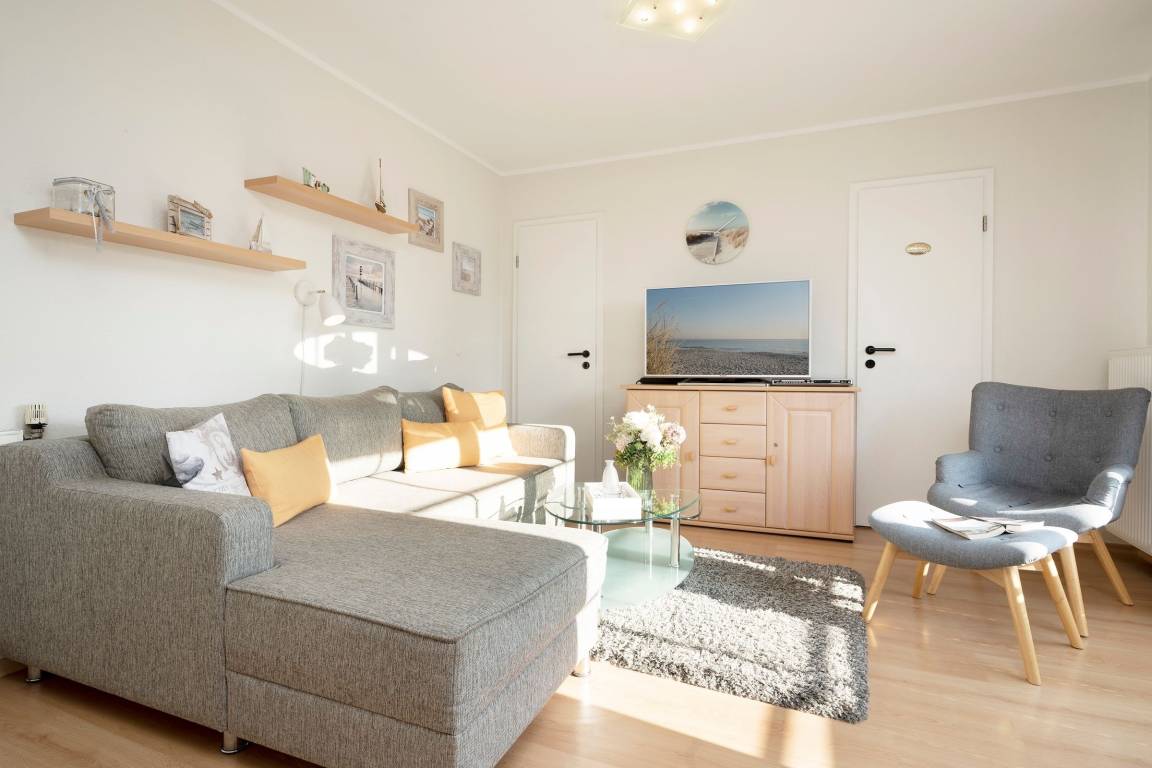 Es verfügt über einen stilsicher eingerichteten Wohnraum mit einem hochwertigen Ecksofa mit Schlaffunktion, sowie integriertem Essplatz und angrenzender, gut ausgestatteter Küche mit praktischen Annehmlichkeiten wie Spülmaschine, Mikrowelle mit Grillfunktion, Backofen und Kaffeemaschine für den frischen Kaffee am Morgen. Für Unterhaltung sorgen ein neuer Flachbildfernseher, ein DVD-Player, eine Stereo-Anlage, sowie ein kostenloser WLAN-Zugang. Noch dazu führt ein direkter Zugang vom Wohnzimmer auf den möblierten Balkon - von hier aus hören Sie die Wellen rauschen, pures Ostseegefühl. Das separate Schlafzimmer ist mit einem Doppelbett (160x200 cm), einem geräumigen Kleiderschrank und einem 2. neuwertigen TV ausgestattet. Im hellen und großzügigen Badezimmer ist durch Annehmlichkeiten wie einer Eckdusche, Waschtisch und WC für Komfort gesorgt. Das gesamte Interieur ist nordisch frisch und gemütlich - ein herrliches Feriendomizil!