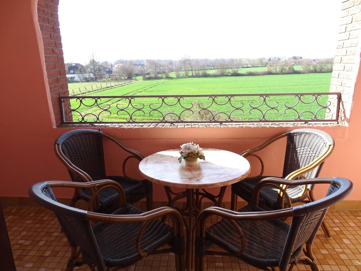 Möblierte Süd-Loggia mit freiem Ausblick über Feld und Wald.