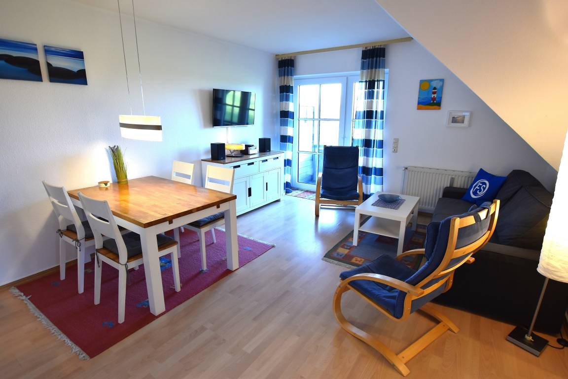 Wohnzimmer mit 2er Couch, zwei Sesseln, TV, Esstisch mit vier Stühlen, mit neu integrierter Küchenzeile 2026. Zugang zum überdachten, möblierten Balkon mit sehr schönem Ausblick ins Landschaftsschutzgebiet (Naturerlebnisraum Oldenburger Graben).