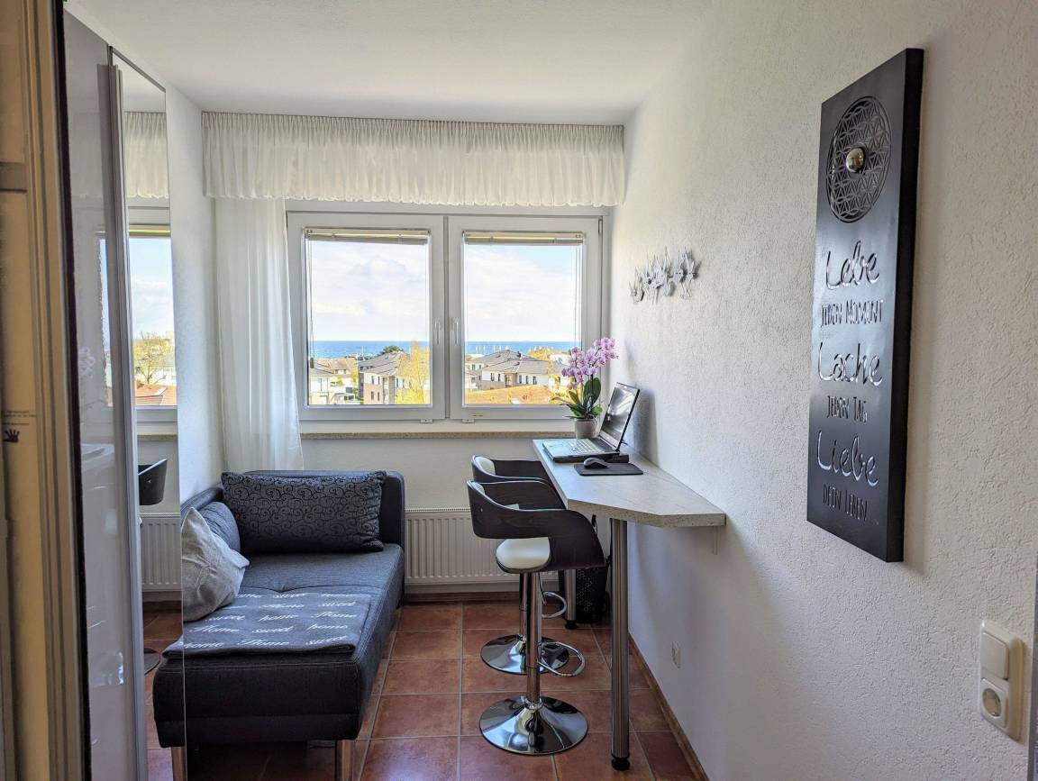 Das Feriendomizil in der 4. Etage des Hauses Berolina bietet auf 47 m² reichlich Platz für max. 2 Erwachsene. Der Eingangsbereich mit Garderobe führt in das Wohn- und Schlafzimmer, das mit einem gemütlichen Relaxsofa, TV und Elektrokamin ausgestattet ist. Der Schlafbereich umfasst ein Doppelbett (180 x 200 cm) und Außenjalousien. Ein separater Raum mit erhöhtem Arbeitsplatz, Sofa und Kleiderschrank ist durch eine Schiebetür vom Küchenbereich abtrennbar. Die voll ausgestattete Küche bietet eine Spülmaschine, Herd und einen Essplatz für 2 Personen. Das Badezimmer verfügt über eine Badewanne und WC. WLAN ist verfügbar. Der Zugang zum hauseigenen Schwimmbad und Tischtennisraum erfolgt mit dem Wohnungsschlüssel. Haustiere sind nicht gestattet, und Rauchen ist nur auf dem Balkon erlaubt.