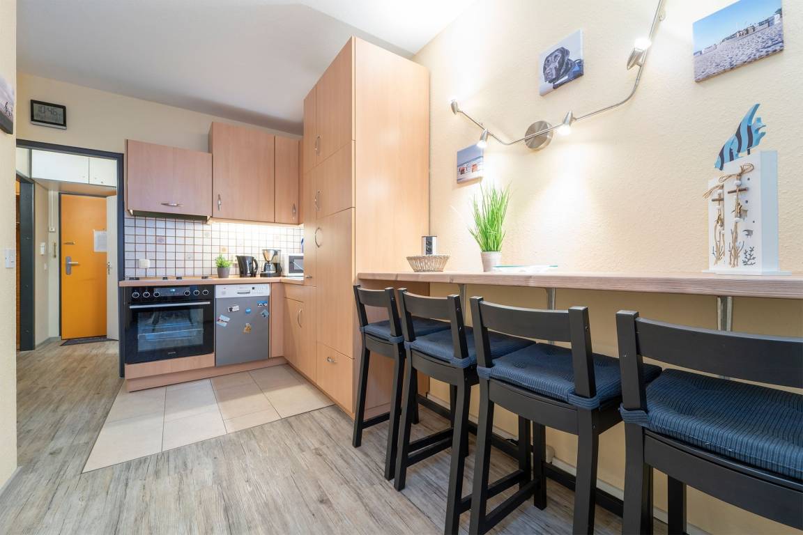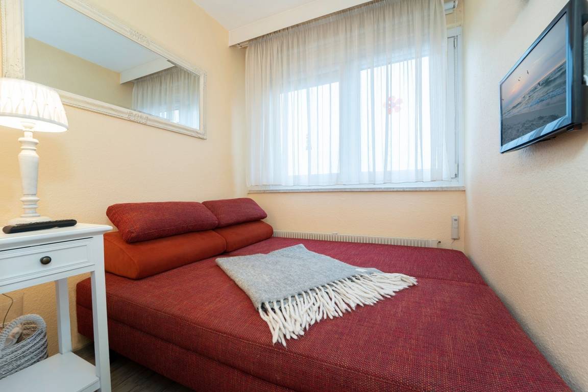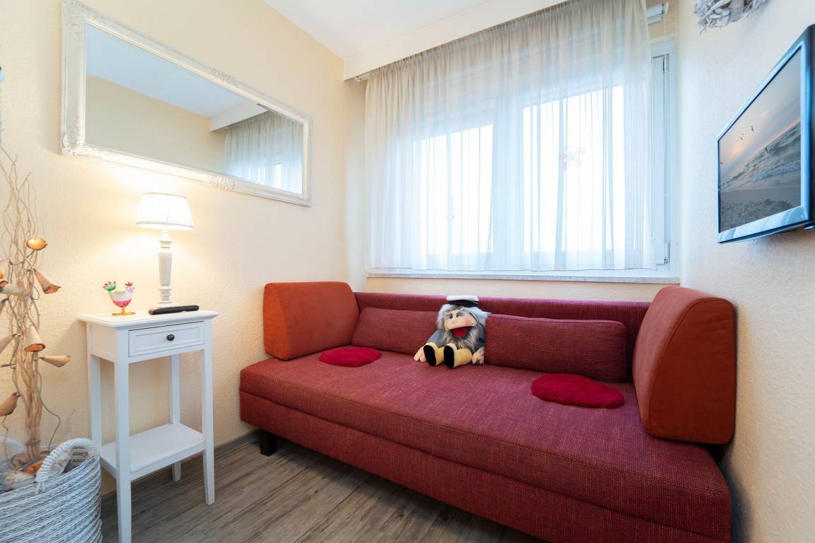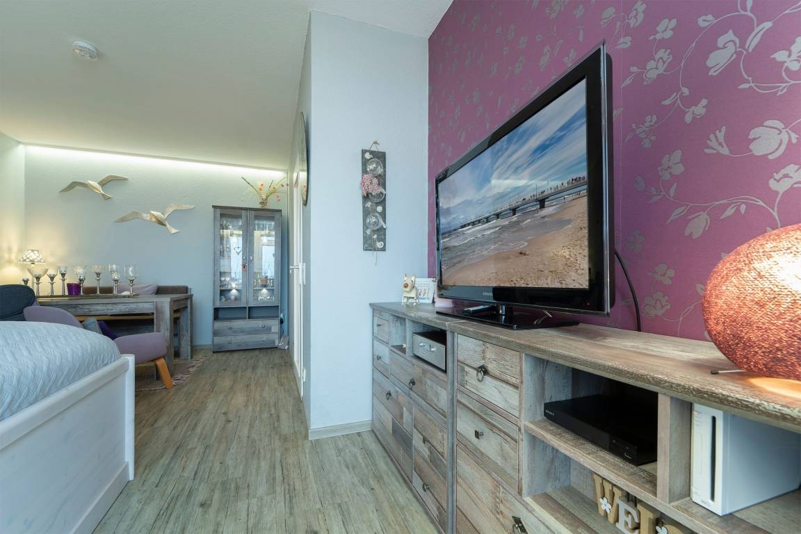 Ein geräumiger Garderobenraum bietet Ihnen viel Stauraum für Ihre Urlaubsgarderobe. Im kombinierten Wohn- und Schlafbereich erwartet Sie ein komfortables Doppelbett (2x 90x200 cm), ein Esstisch mit Platz für 4 Personen sowie ein Flachbildfernseher mit Full-HD-Empfang. Für weitere Unterhaltung im Urlaub sorgen die Stereo-Anlage mit integrierter Docking-Station für iPod/iPhone inklusive Ladestation bzw. MP3/USB-Anschluss und integriertem CD-Spieler sowie eine Wii. Vom Wohnbereich aus gelangen Sie auf den überdachten, möblierten Balkon. Die separate Küche ist z. B. mit einem Geschirrspüler, einem 4-Plattenkochfeld sowie weiteren 4 Sitzmöglichkeiten gut ausgestattet. Durch die Küche gelangen Sie in ein weiteres, kleines Schlafzimmer mit Fenster und ausziehbarer Couch (140x200 cm). Das innenliegende Badezimmer verfügt über eine Badewanne. Der WLAN- und Telefon-Anschluss sind selbstverständlich inklusive.