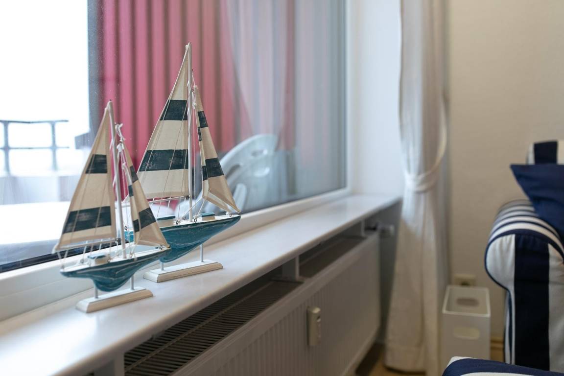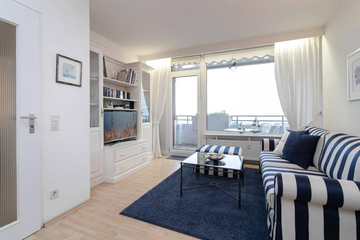 Diese Wohnung setzt Maßstäbe in Bezug auf Ausstattung, Farben und Einrichtung. Der kombinierte Wohn-/Schlafraum ist in maritimem blau und weiss gehalten, von hier aus haben Sie einen fantastischen Blick über die Dächer von Dahme auf die Ostsee.