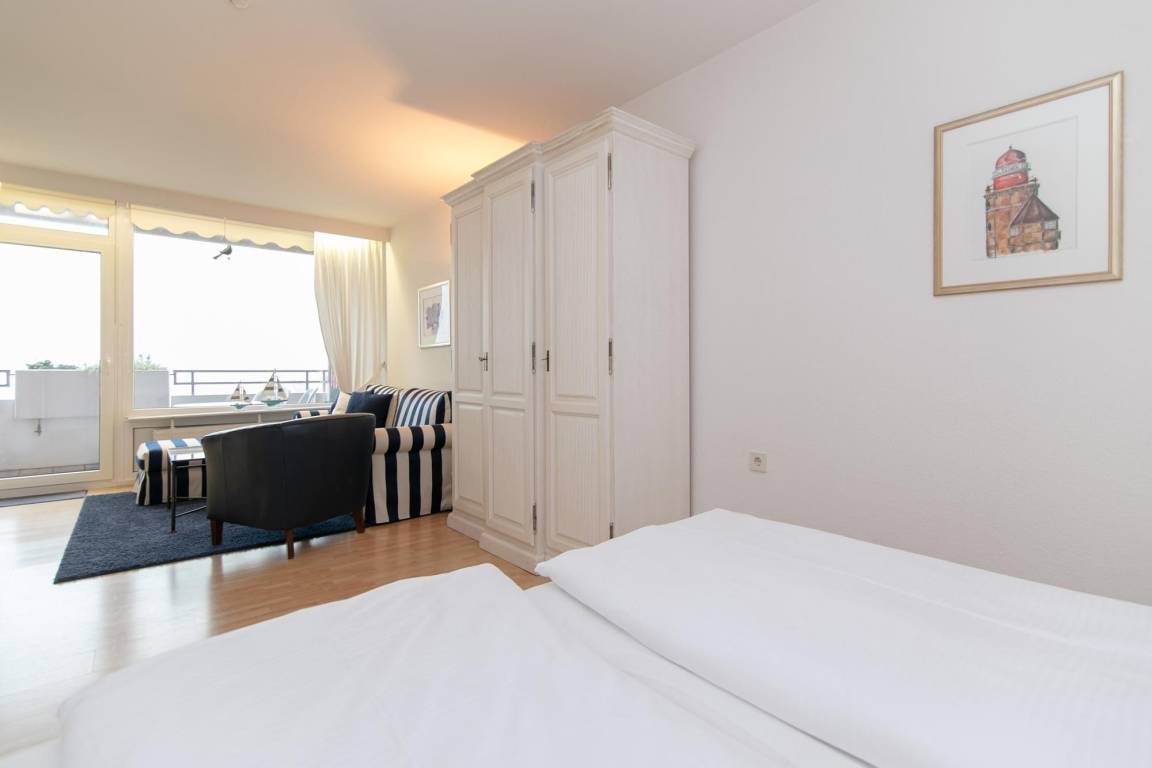 Das separate Schlafzimmer bietet mit 2 Einzelbetten einen weiteren komfortablen Schlafplatz. Auch von hier genießen Sie den herrlichen Blick auf das Meer. In der modernen Küche erleichtert ein Geschirrspüler den Urlaubsalltag. Im Badezimmer setzt sich das moderne Design fort und in dieser Wohnung ist kostenloses, schnelles WLAN selbstverständlich.