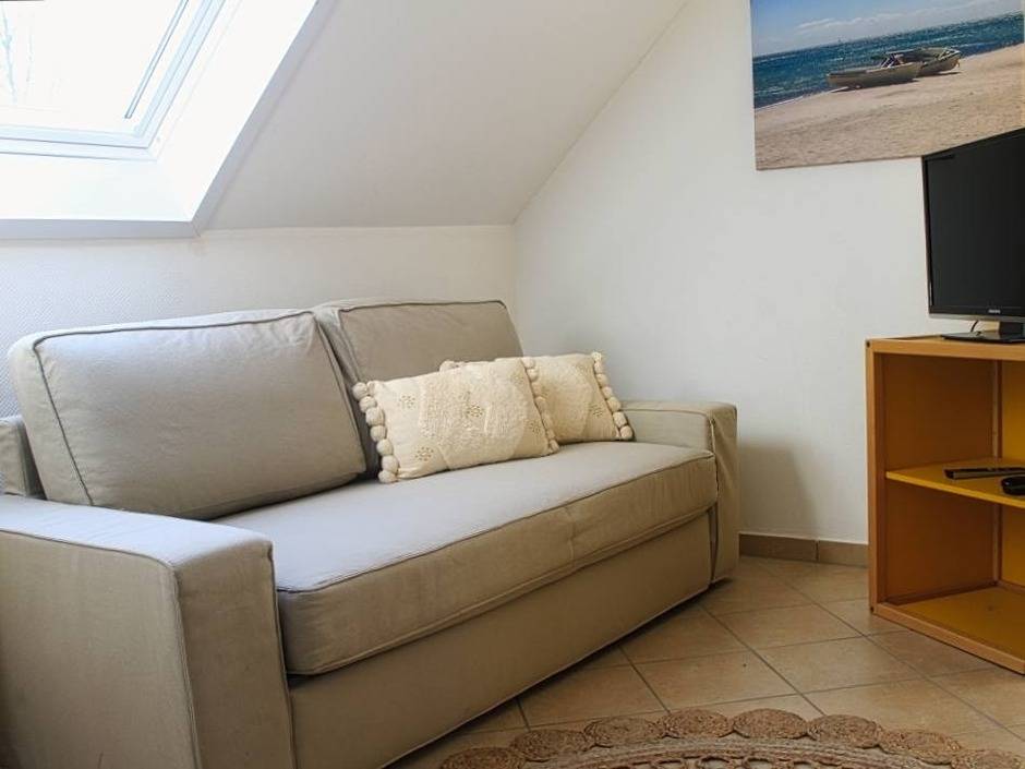 Vom Wohnraum mit offener Küche gelangt man auf den mit Terrassenmöbeln ausgestatteten Balkon, (ca.14 qm). Zur Wohnung gehören zwei Schlafzimmer, wobei das zweite Schlafzimmer mit einem Einzelbett und einem Schlafsofa und TV ausgestattet ist.