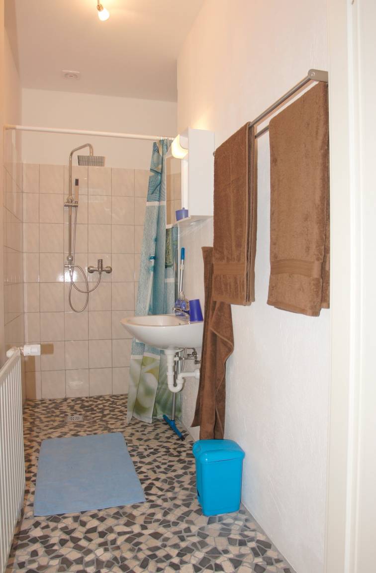 Im Bad erwartet sie eine ebenerdige, italienische Dusche.