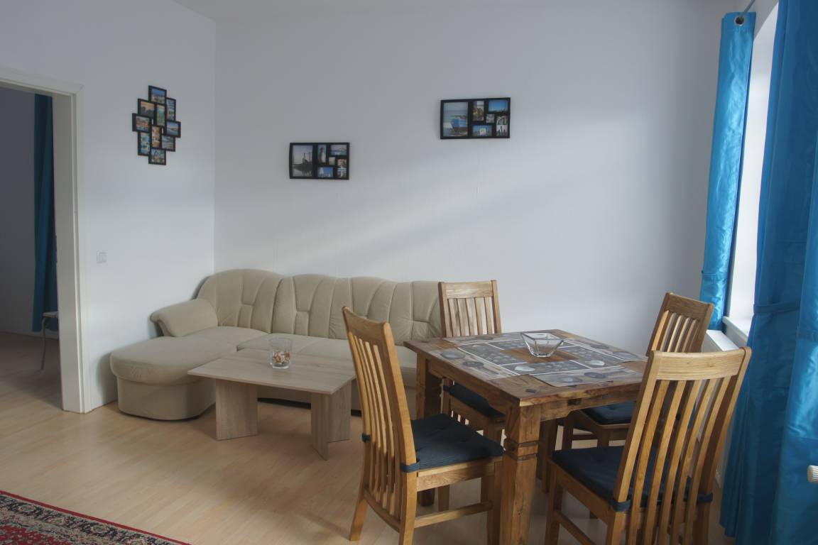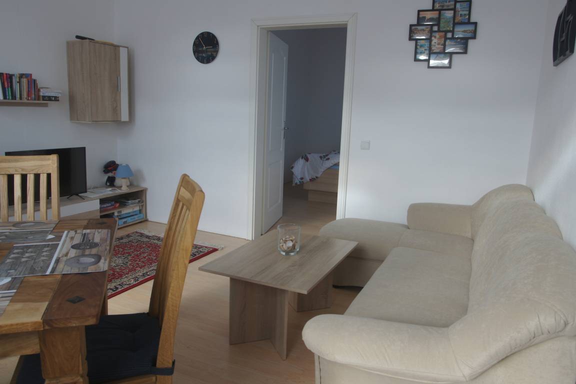 Ein gemütliches Wohnzimmer mit Sofa, Flachbild TV und einer Essecke lädt zum verweilen ein. Für entspannende Abende gibt es Spiele und Bücher.
