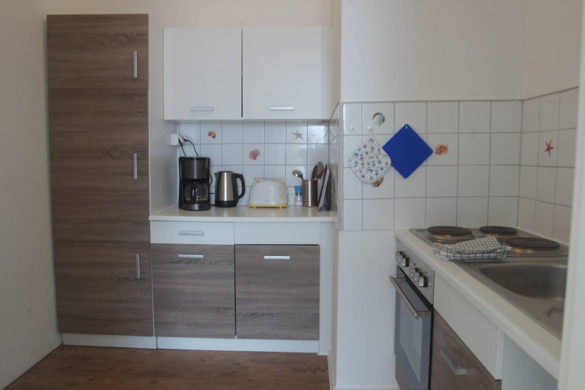 Eine separate Küche mit Elektroherd (4 Platten), Kühlschrank mit Gefrierfach, einer Kaffeemaschine, Wasserkocher und Toaster vervollständigen die Wohnung.