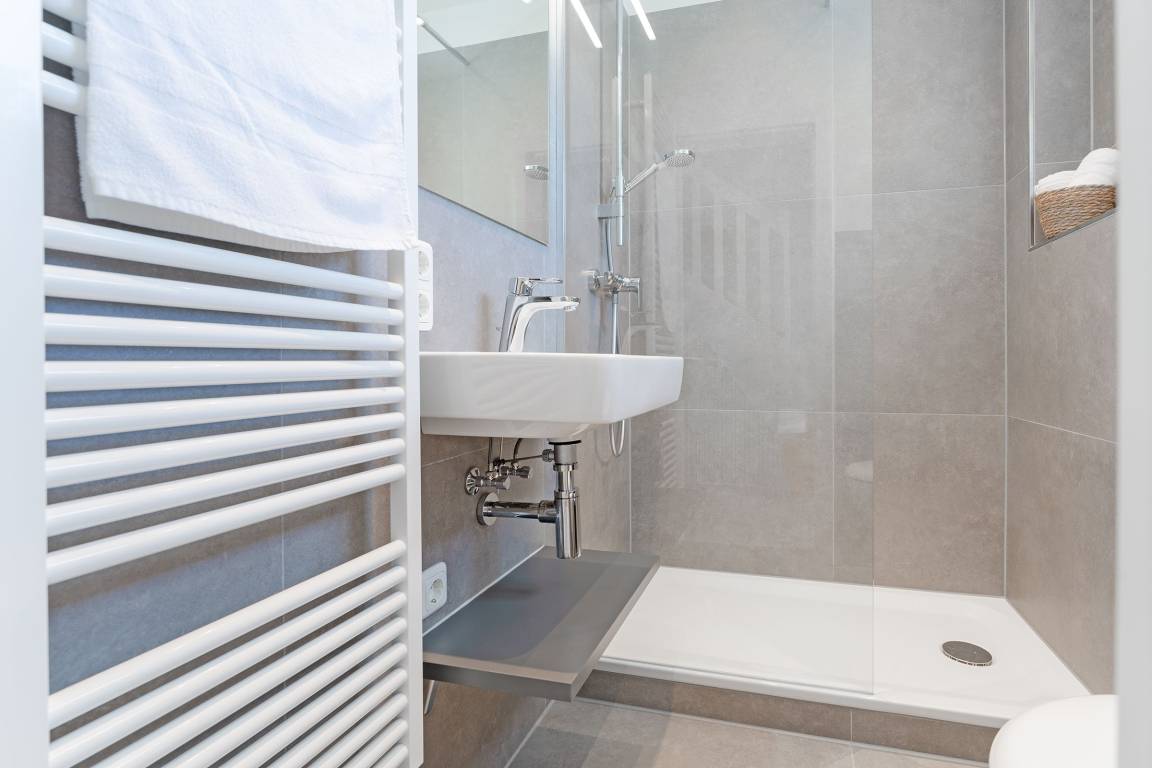 „Die Wohnung ist zweckmäßig aber die Dusche und das Bad sehr eng. Für 4 Erwachsene zu eng und für große oder kräftige Leute auch nicht zu empfehlen.“