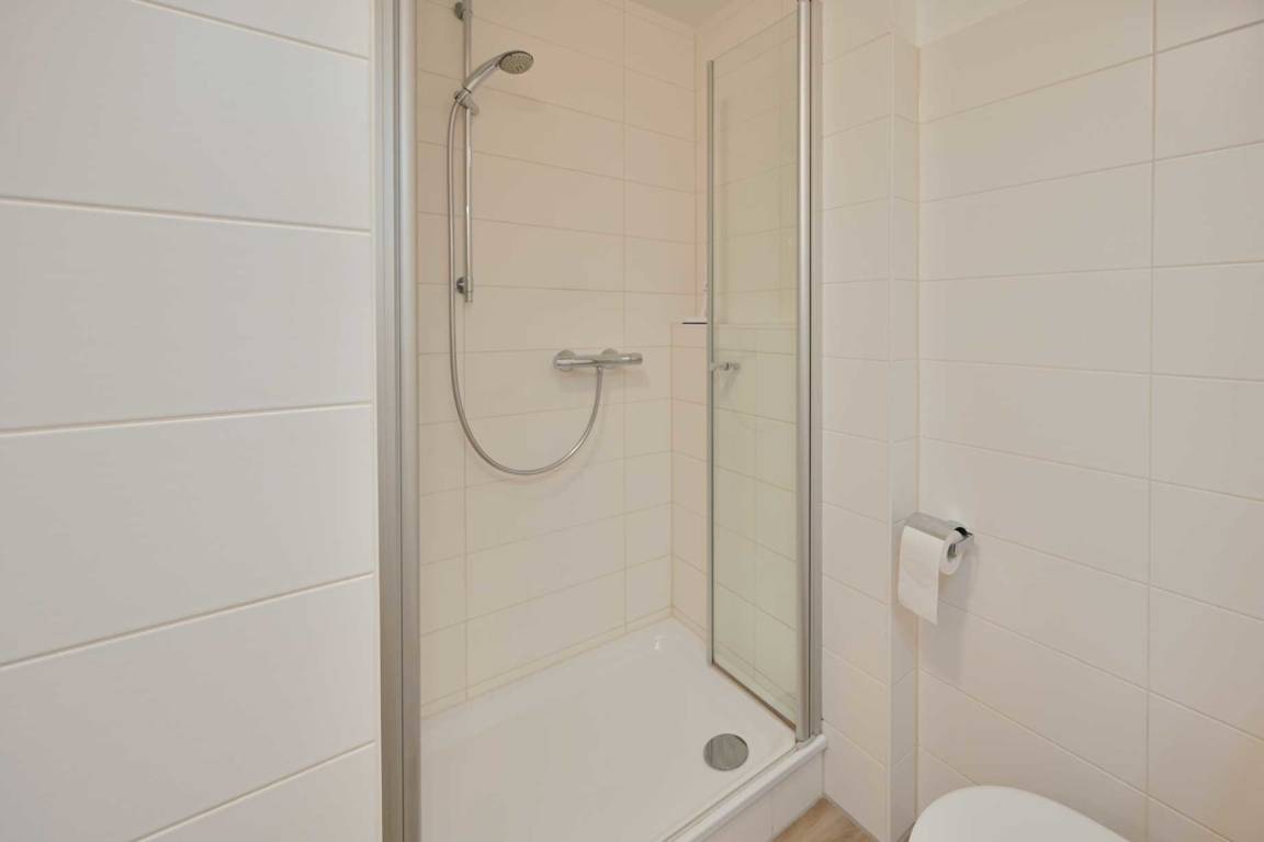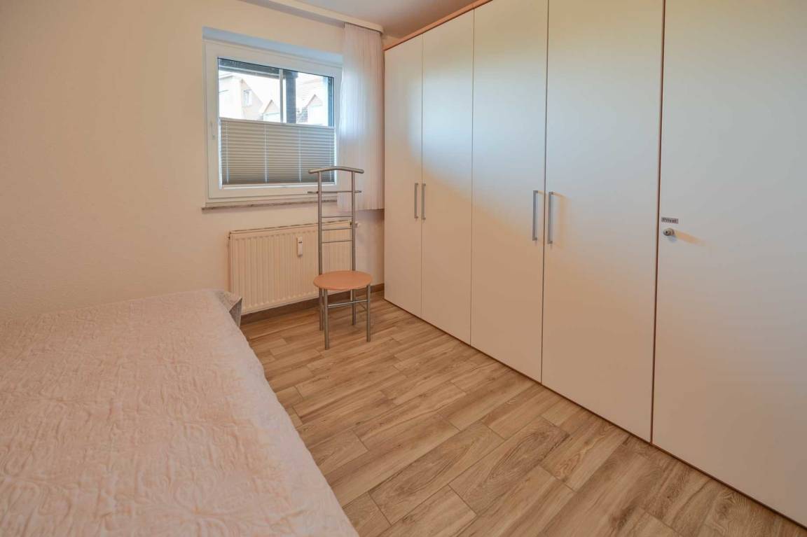 Der separate Schlafraum ist mit einem Doppelbett 2x Einzelmatratzen(190 x 200 cm), Nachttischen, und einem 4-türigen Kleiderschrank ausgestattet. Zudem verfügt die Ferienwohnung über ein modernes Bad mit WC, einem Spiegelschrank und Fön, und eine 80 x 100 cm Duschwanne mit niedrigem Einstieg.