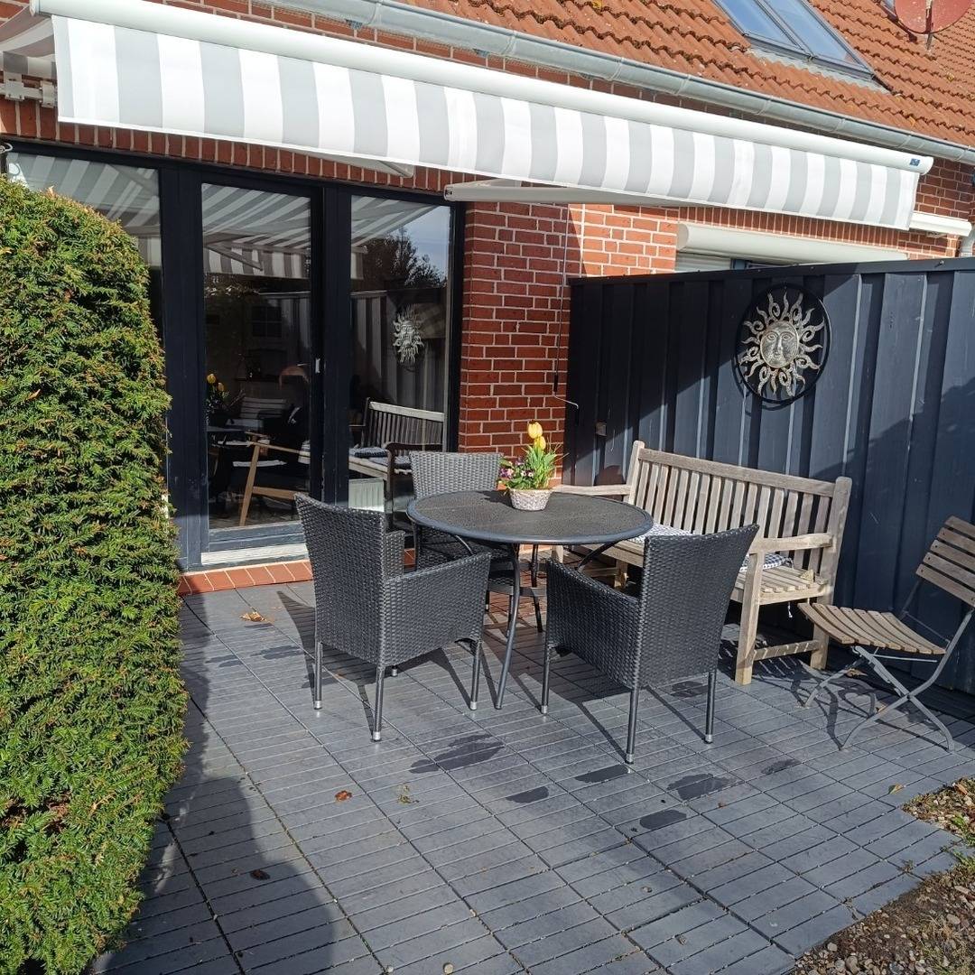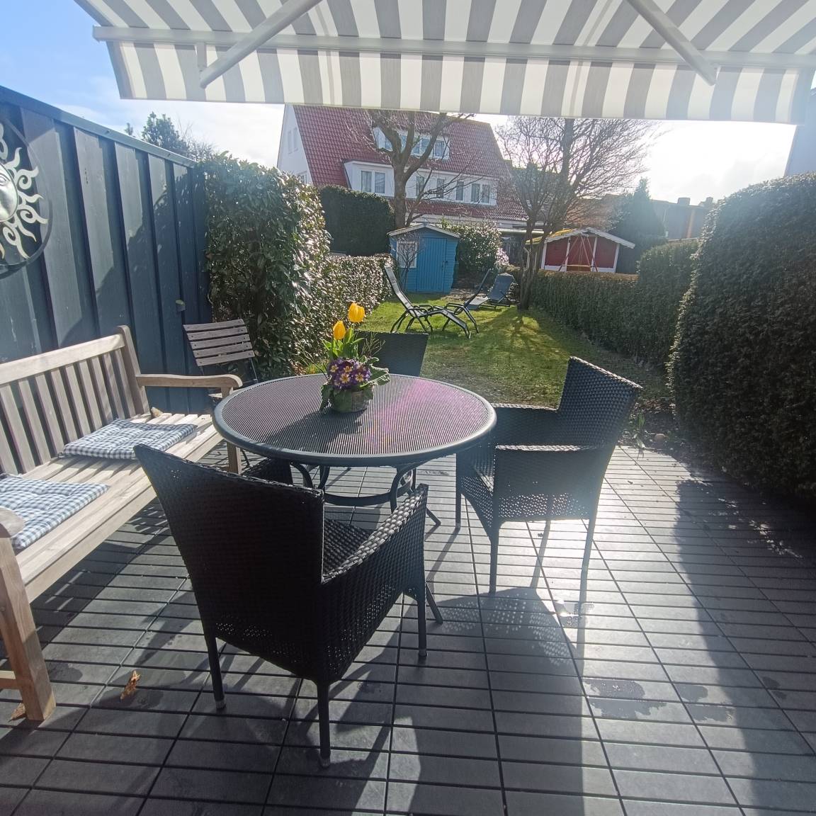 Im Außenbereich lädt eine sonnige Terrasse mit kleinem Garten zum Verweilen ein - perfekt für ein Frühstück an der frischen Luft oder einen entspannten Abend mit einem Glas Wein.