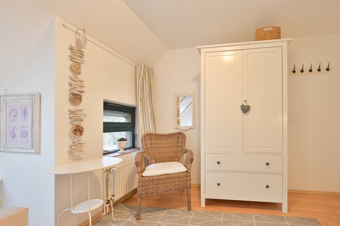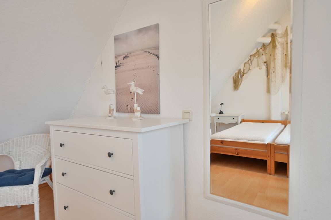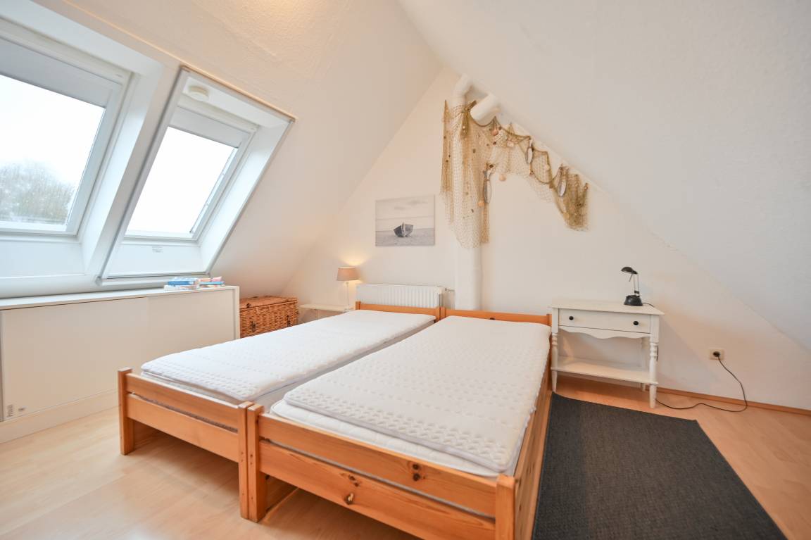 Im zweiten Obergeschoss (offenes Dachgeschoss) liegt ein weiteres Schlafzimmer mit Einzelbett, das mit seiner gemütlichen Atmosphäre und der ruhigen Lage unter dem Dach zum Träumen einlädt. Von hier oben haben Sie einen Blick auf die Ostsee.