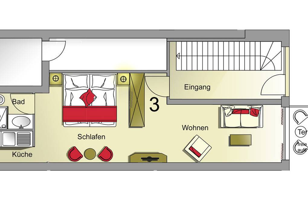 Die Wohnung hat eine kleine Küche sowie ein Duschbad. In Ihrem Wohn - Schlafraum wird es Ihnen an nichts fehlen, ein kostenloser WLAN-Zugang wartet auf Sie im Haus.