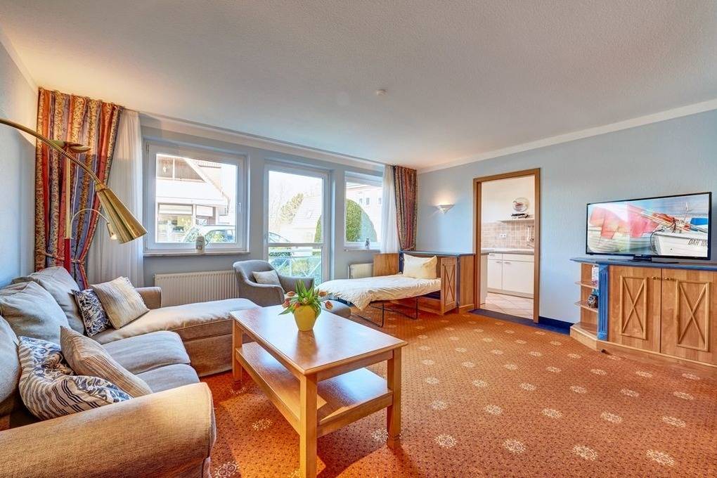 Es erwartet Sie eine drei Zimmerwohnung auf ca.68 m² für max. 4 Erw. + ein Kleinkind. ein großer Eingangsbereich mit Garderobe, ein geschmackvoll eingerichteter Wohnraum mit Sofabereich, Flachbild-TV, Esstisch und direktem Zugang zur bestuhlten Südterrasse. eine separater Küche mit Geschirrspüler, Ceranfeld, Mikrowelle und Waschmaschine. Schlafraum (1) mit Doppelbett (2x90x200), Kleiderschrank, Nachtisch, Nachtischlampe und Flachbild-TV. Schlafraum (2) mit zwei Einzelbetten (90x200), Kleiderschrank, Nachtisch, Nachtischlampe. sowie einem Duschbad mit Dusche, Waschbecken, Spiegelschrank und WC. WLAN steht Ihnen kostenfrei zur Verfügung.