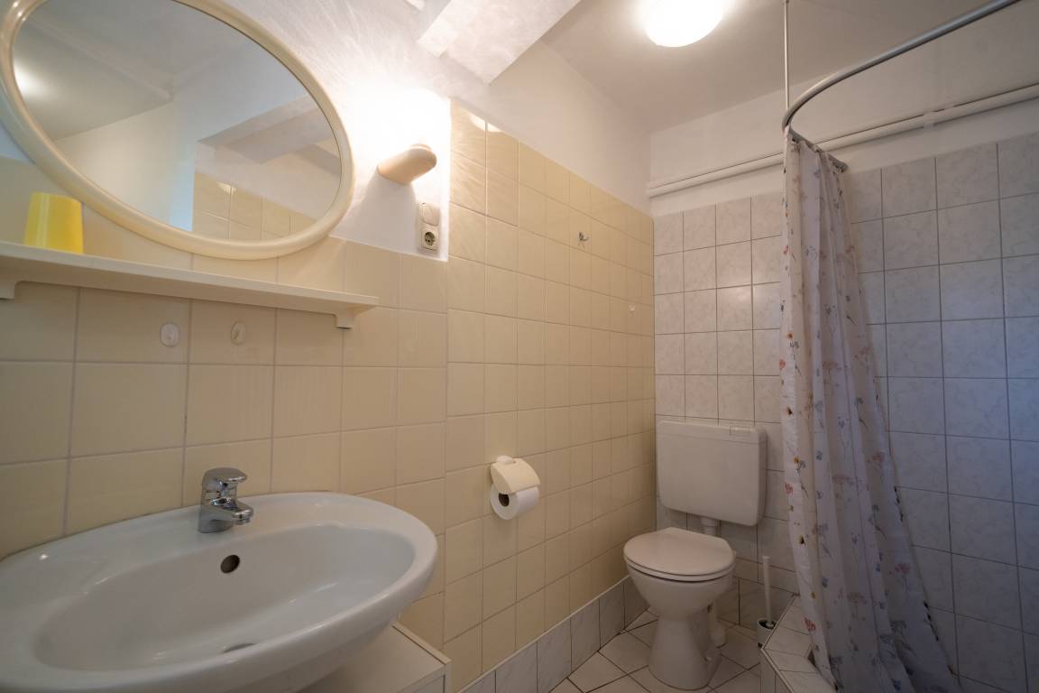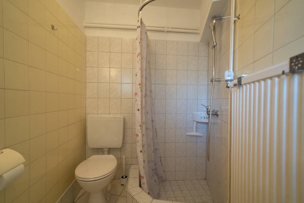 Das Badezimmer ist mit Dusche und WC ausgestattet.