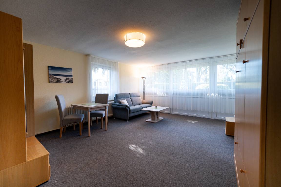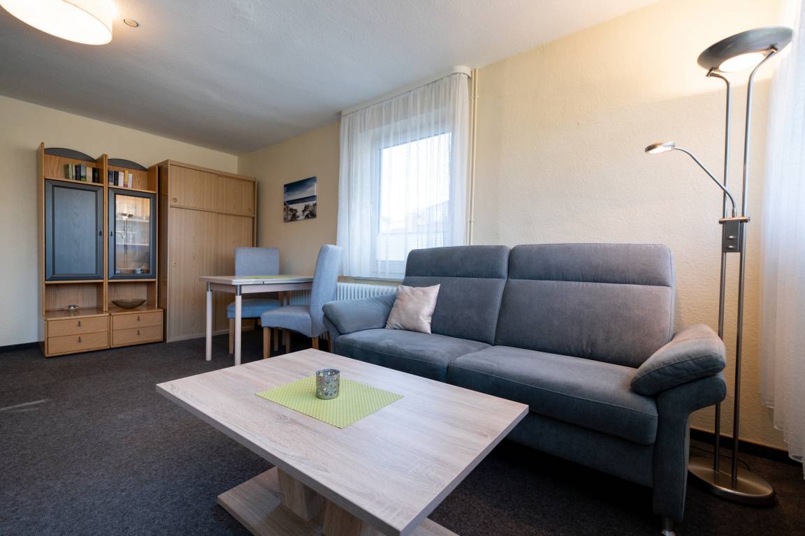Im Wohnbereich können Sie auf der Couch entspannen. Die Einrichtung ist zweckmäßig und es gibt eine Sitzecke für bis zu 2 Personen.