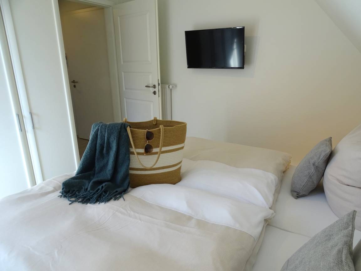 1 Schlafzimmer mit Doppelbett 180x200 und Fernseher sowie jeweils 1 Schlafzimmer mit einem Einzelbett 90x200. Ein Badezimmer mit Sauna und Dusche und ein Gäste- WC stehen in diesem Ferienobjekt zur Verfügung.