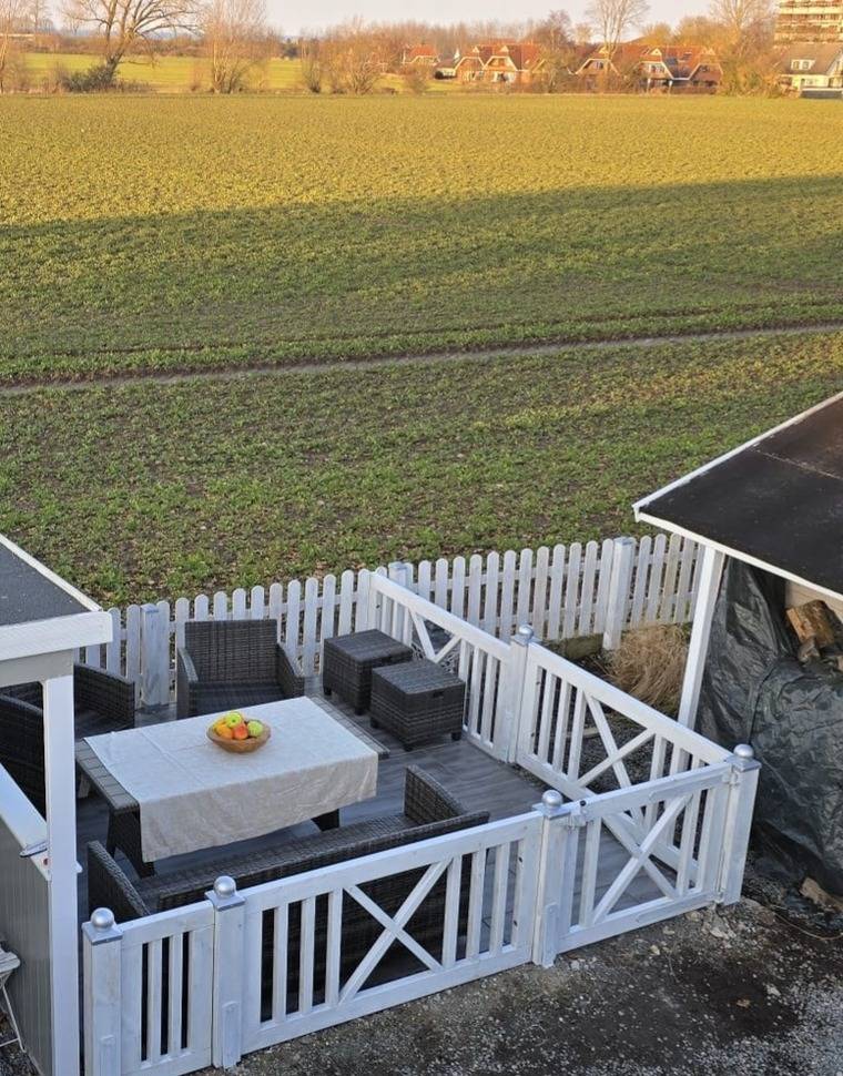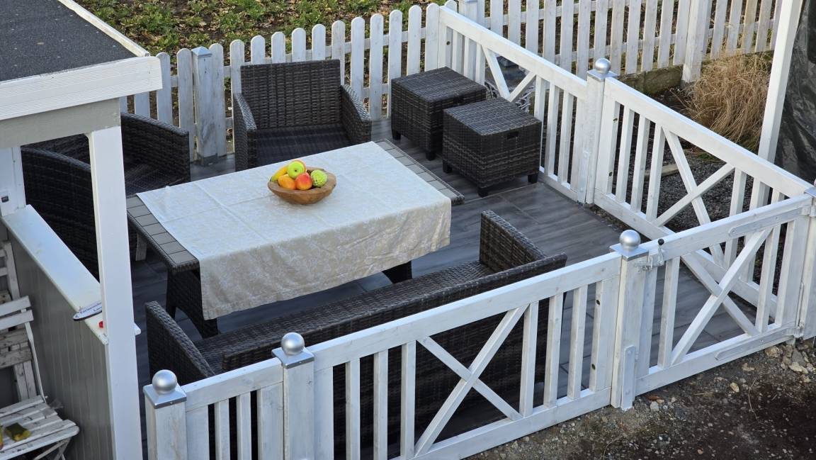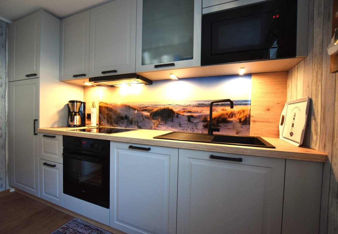 Im Erdgeschoss befindet sich der Eingangsbereich mit Sitzgelegenheiten, eine gut ausgestattete Küche mit Esstisch und Sitzgelegenheiten, ein Badezimmer mit WC, Waschbecken und Dusche, eine keine Abstellkammer und ein Schlafzimmer mit Doppelbett (1x180x200) und Kleiderschrank. In den oberen Wohnbereich gelangen Sie über eine Treppe. Der Wohnbereich ist offen, hell und hübsch gestaltet, hier befinden sich 2 Sofa's, ein Sessel und ein Holzofen für die kältere Jahreszeit für wohlige Wärme zum genießen.... Ein 2. separates Schlafzimmer mit 2 Einzelbetten (90x200cm) und einem Kleiderschrank befindet sich ebenfalls im Obergeschoss der Wohnung. Vor Ihrem Urlaubsdomizil befindet sich eine möblierte Terrasse, auf der Sie auch grillen dürfen. Eine weitere 2. möblierte Terrasse zum Entspannnen direkt am Feld wartet ebenfalls auf Sie.