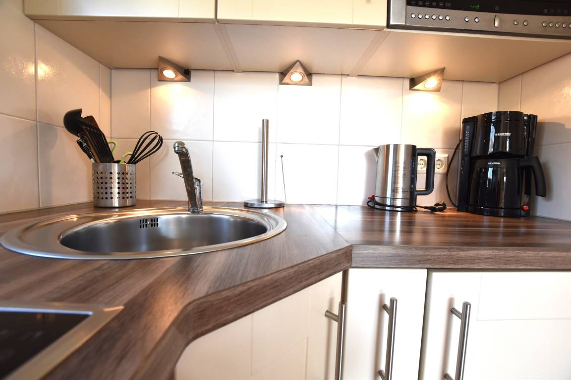 -Die Küche ist selbstverständlich voll ausgestattet, u.a. mit Mikrowelle mit Grillfunktion, einem Herd mit 4-Platten-Cerankochfeld, Kühlschrank mit Gefrierfach, Kaffeemaschine, Toaster, Mixer, Wasser- u. Eierkocher.