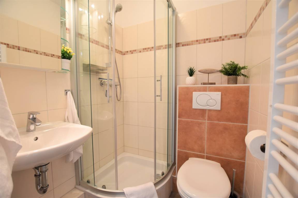 -Das Duschbad verfügt über Dusche, Waschbecken, Toilette und Spiegellschrank mit ausreichend Stauraum.