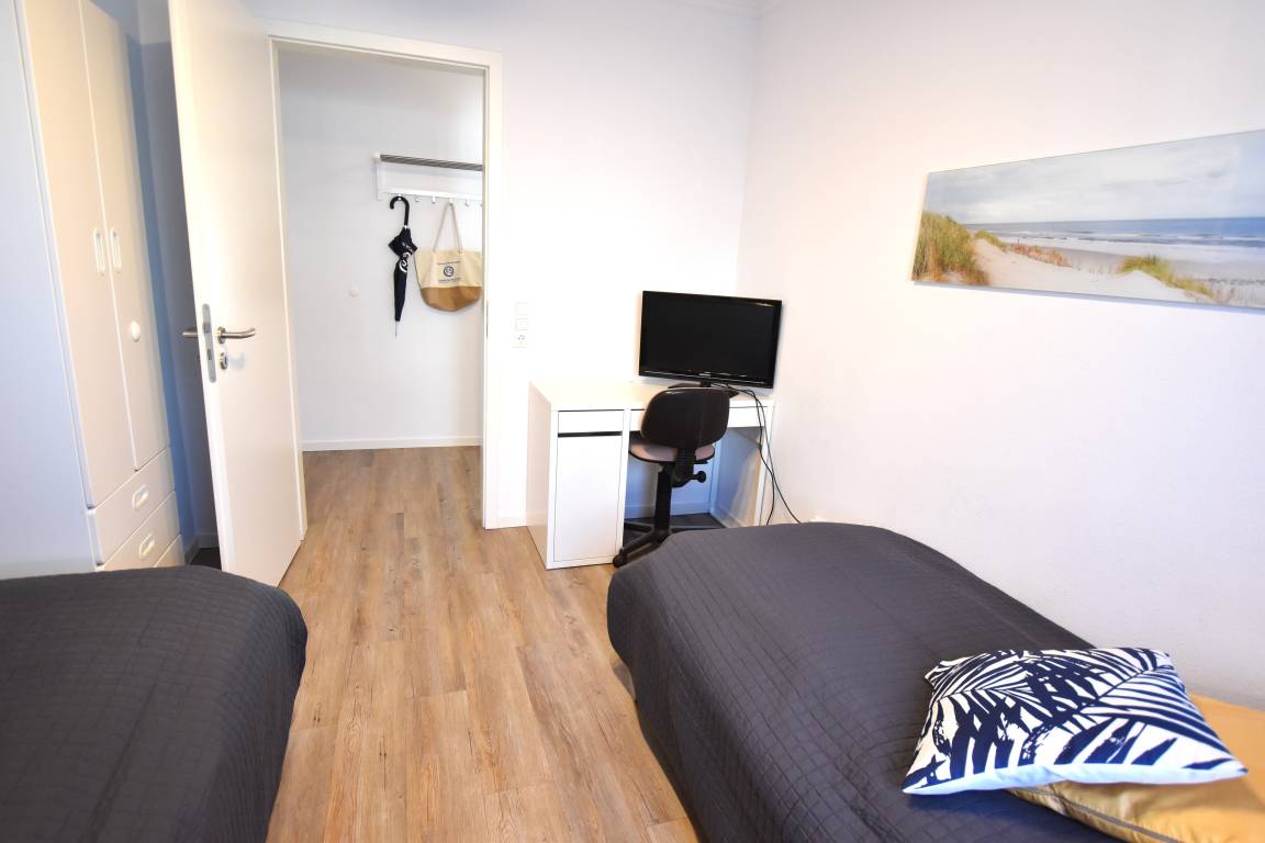 Schlafzimmer mit Doppelbett (2 x 90 x 200 cm), Kleiderschrank, Nachttischleuchten, Verdunklungsvorhänge. Im zweitem Schlafzimmer befinden sich zwei Einzelbett (90x200 cm), kleiner Schreibtich, TV und ebenfalls Verdunklungsvorhänge.