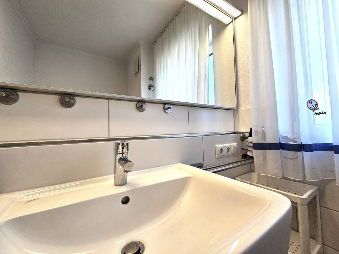 Die Wohnung verfügt über 3 helle Zimmer sowie einen sonnigen bestuhlten Südbalkon mit Strandkorb. Dieser kann vom Wohn-/Esszimmer mit voll ausgestatteter offener Küche begangen werden. Ferner steht Ihnen ein Badezimmer mit bodengleicher Dusche und ein Hauswirtschaftsraum mit Waschmaschine und Kofferablage zur Verfügung.