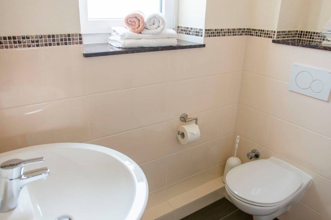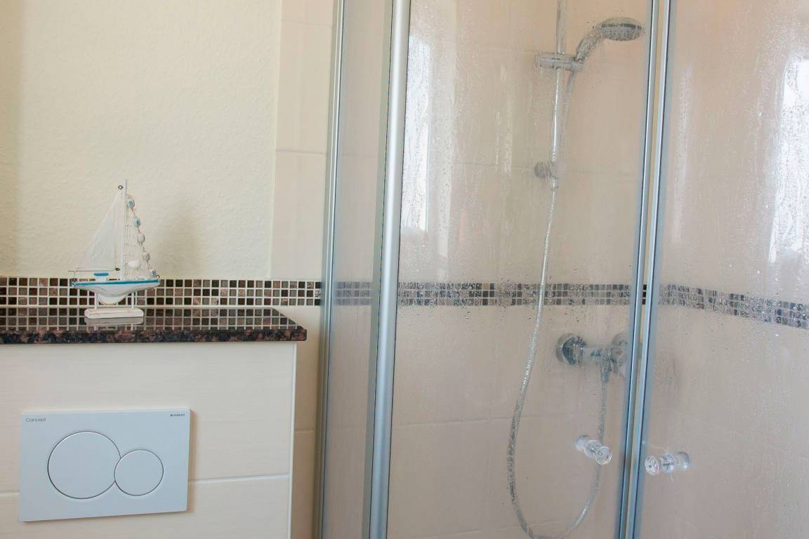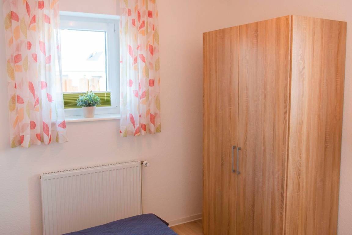 Die Wohnung verfügt über zwei Schlafzimmer, die jeweils mit einem Doppelbett (zwei Einzelmatratzen) und einem Kleiderschrank ausgestattet sind. Das tageslichthelle Badezimmer ist mit einer Dusche und einem WC versehen.