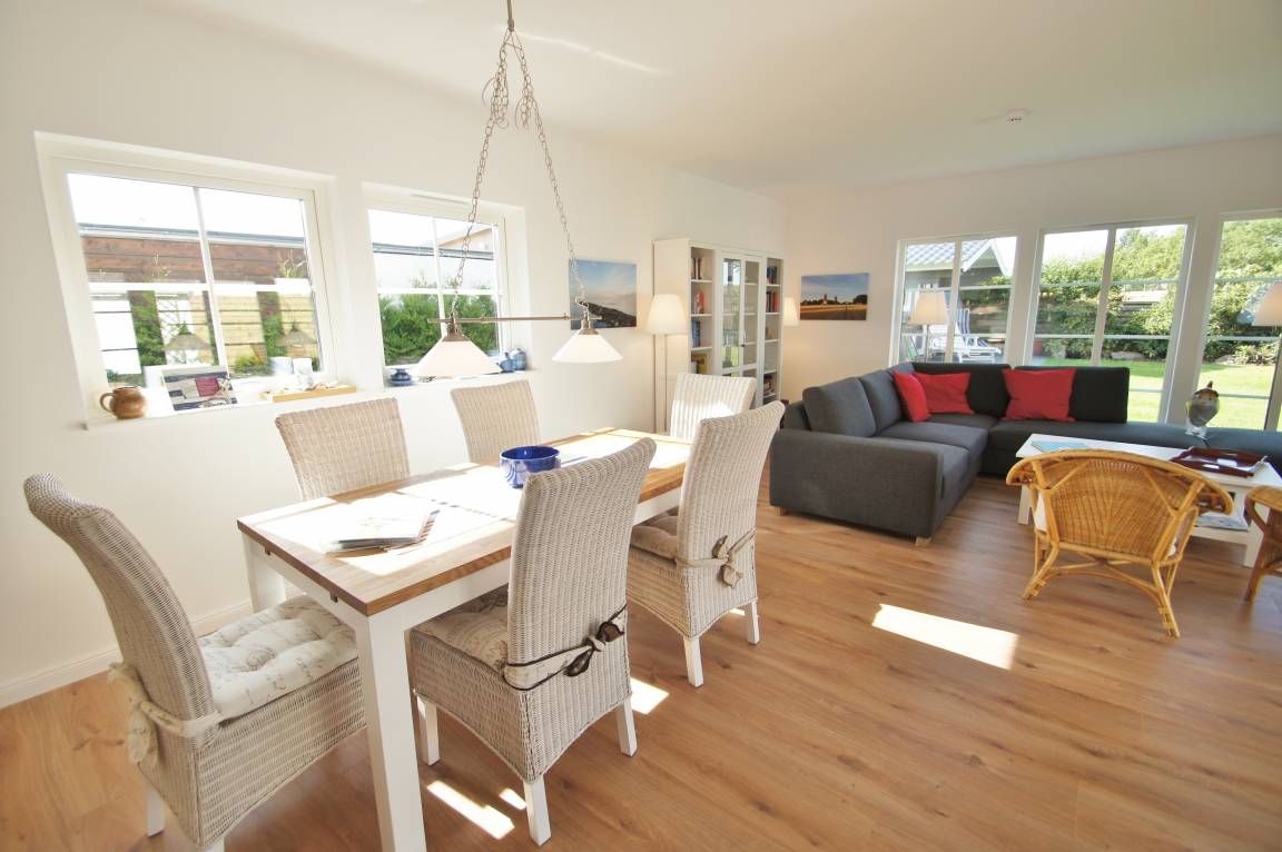 Das Ferienhaus ist offen und großzügig gestaltet, der offene Wohnbereich ist freundlich und modern eingerichtet, hier sorgt ein Dänischer Holzofen auch in der kälteren Jahreszeit für ein warmes Wohlfühlklima. Die in den Wohnbereich integrierte und voll ausgestattete Küche lässt keine Wünsche offen. Im Ferienhaus sind Fliesen in den Bädern, der Küche und auf dem Flur als Fußbodenbelag verlegt, in den Schlafzimmern und im Wohnzimmer befindet sich ein Laminatfußboden. Die integrierte Fußbodenheizung läßt sich in jedem Raum separat regeln. Es stehen Ihnen 2 Duschbäder mit bodengleicher Dusche zur Verfügung. Die an das Wohnzimmer und an das 3. Schlafzimmer angrenzende möblierte Terrasse ist in Süd/Westlage am Haus angelegt und bietet Ihnen ab der Mittagszeit schöne Sonnenstunden. Im Aussenbereich stehen Ihnen 4 Sonnenliegen und ein Holzkohlegrill zur Verfügung. Die Schlafzimmer sind individuell eingerichtet. Das 1. Schlafzimmer vom Eingangsbereich gesehen verfügt über ein Doppelbett ( 160x200cm ), LCD TV und Kleiderschrank, das 2. Schlafzimmer verfügt über ein Kassettenradio, 2 Einzelbetten ( 90x200cm ) und Kleiderschrank. Im 3. Schlafzimmer befindet sich ein Doppelbett ( 180x200cm ), 2 Kleiderschränke und das 2. Duschbad. Vom 3. Schlafzimmer haben Sie direkten Terrassenzugang. Im separatem Nebengebäude haben Sie die Möglichkeit mit 2 weiteren Personen Ihren Urlaub in einem 160x200cm Doppelbett zu genießen. Insgesamt stehen Ihnen ca. 130m² Wohnfläche inkl. seperatem Gebäude zur Verfügung.
