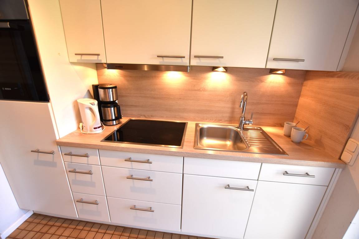 Eingangsflur mit offener Küche mit Wasserkocher, Geschirrspüler und vielem mehr. Schlafzimmer (1) mit zwei Einzelbetten ( 90 cm x 200 cm), Kleiderschrank und Rolladen.