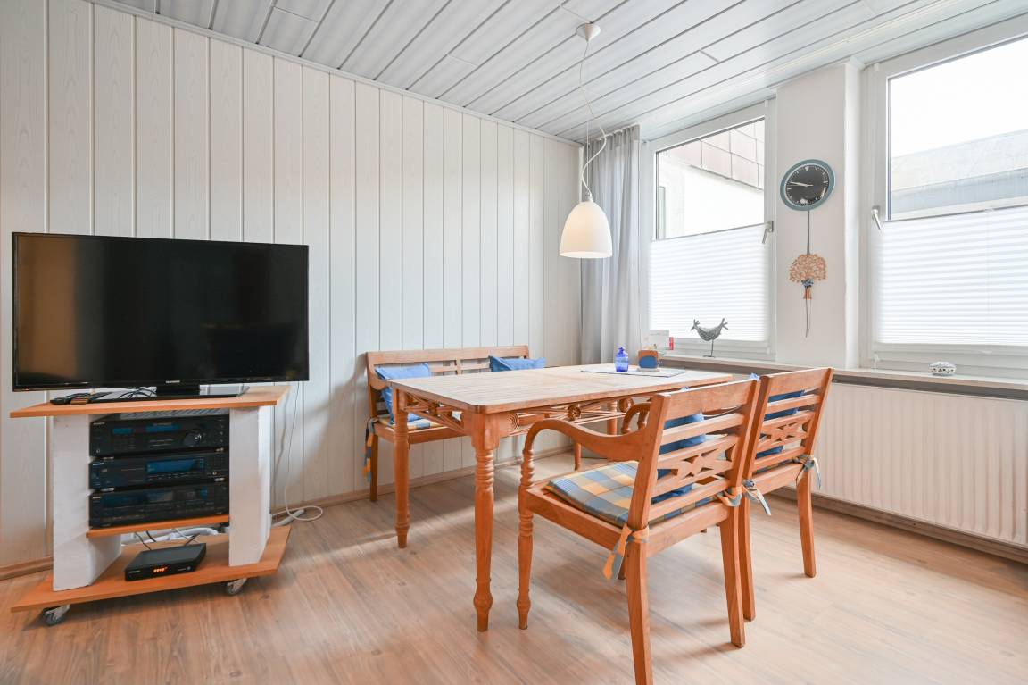 Der Essbereich mit Holztisch, passender Bank und Stühlen lädt zum ausgiebigen Frühstücken ein.