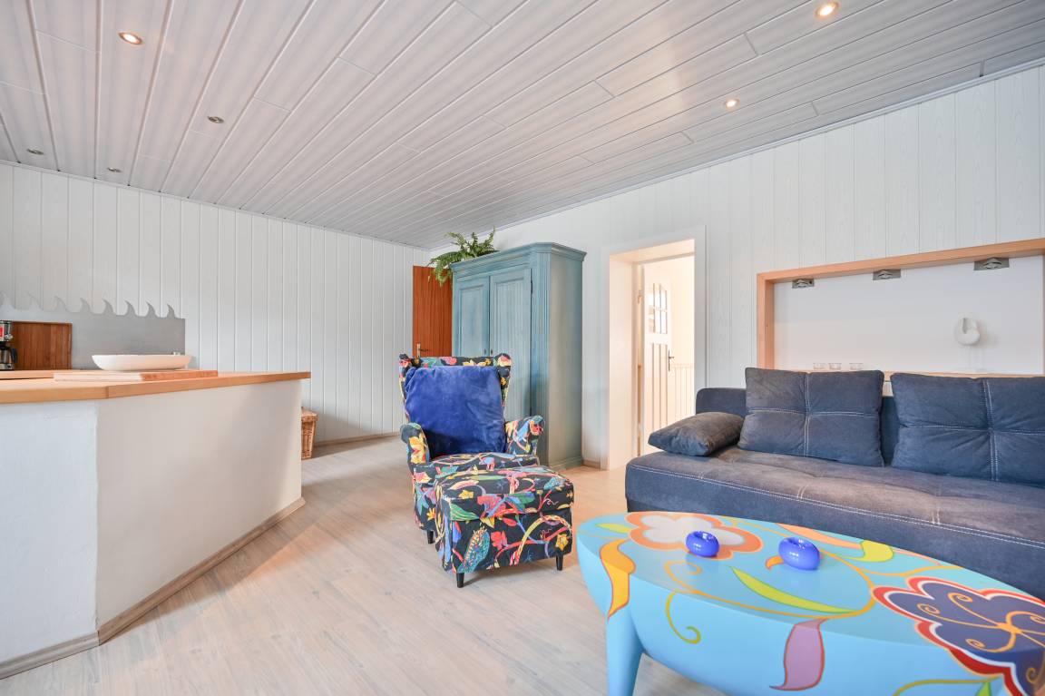 Der schöne Wohnbereich der Fewo ist mit einer Eck-Schlafcouch, einem Lesesessel mit Fußhocker, einem Couchtisch und einem verschiebbaren TV-Audio-Möbel eingerichtet.