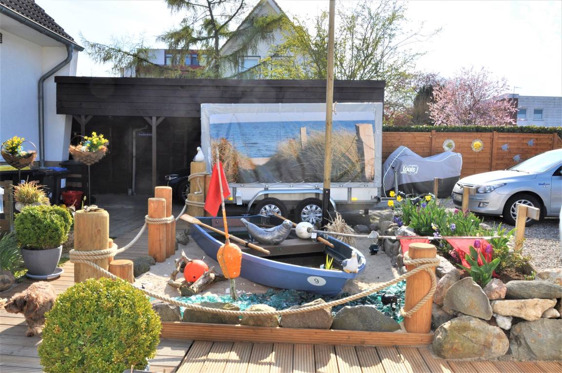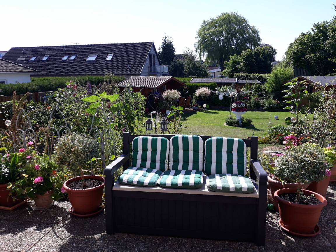 Die Ferienwohnung Nr. 5 "Kutter" befindet sich im Erdgeschoss und bietet genügend Raum, um sich wohl zu fühlen. Man findet ein Schlafzimmer mit zwei Einzelbetten, ein großes Bad mit viel Stauraum, ein kleiner Flur und das geräumige Wohn-/Esszimmer mit Küchenzeile. Von der Terrasse aus bietet sich ein zauberhafter Blick in den verträumten Garten, der gerne zum Verweilen genutzt werden kann. Für die kühleren Tage sorgt ein Kaminofen für ein wohliges Befinden. Im Wohnzimmer bietet die Schlafcouch einen sehr guten Komfort. Die Ferienwohnung wurde mit viel Liebe zum Detail eingerichtet. Das Schlafzimmer mit Einzelbetten bietet ein komfortables Schlafen. Dazu dienen gute Bandscheibenmatratzen und eine große Anzahl an Kopfkissen und Zudecken. Die Küchenzeile bietet einen Glaskeramikherd, eine Kühl- Gefrierkombination, eine Mikrowelle mit Backofenfunktion, einen Backofen, eine Spülmaschine und allen notwendigen Elektrogeräten (Kaffeemaschine, Toaster, Wasserkocher, Mixer, Milchaufschäumer) sowie einer großzügigen Haushaltsbestückung. Reinigungsartikel für Küche und Bad stehen für Sie allzeit bereit.