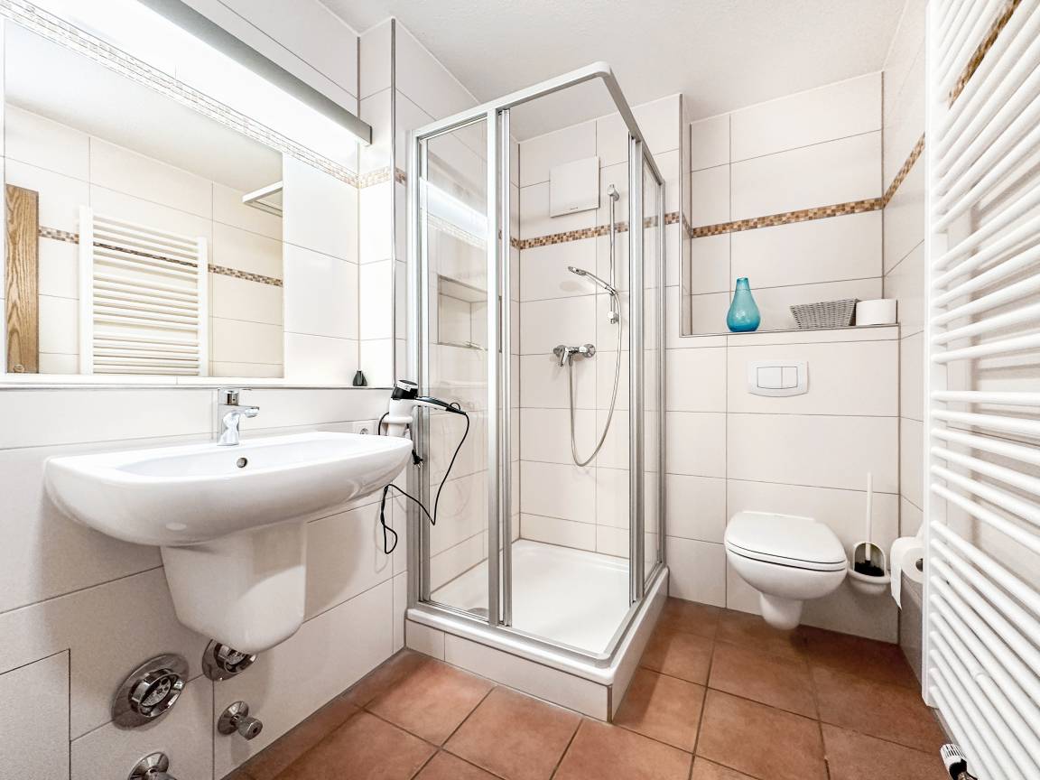 Das Badezimmer im modernen Design verfügt über eine Toilette und eine Dusche mit niedrigem Einstieg. Neben einem großen Waschbecken mit großzügigen Ablageflächen gehört auch ein Fön zur Austattung.