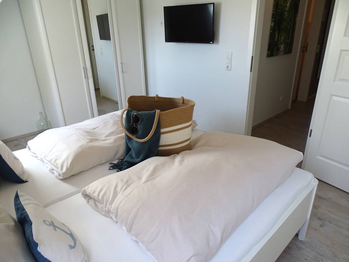1 Schlafzimmer mit Doppelbett 180x200 und Fernseher sowie jeweils 1 Schlafzimmer mit einem Einzelbett 90x200. Ein Badezimmer mit Sauna und Dusche und ein Gäste- WC stehen in diesem Ferienobjekt zur Verfügung.
