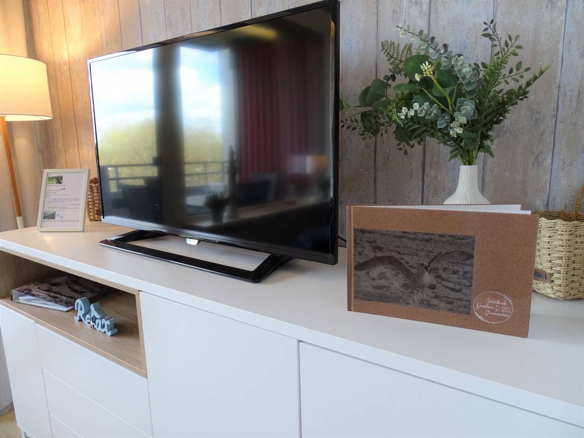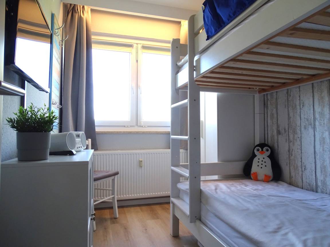 Die Ferienwohnung "Sturmmöwe" verfügt über ein freundlich und modern eingerichtetes Wohn-/Schlafzimmer mit Doppelbett, Flachbildfernseher mit HD Programmen, Stereoanlage und elektrische Rollläden für die Fensterfront zum möblierten Balkon. Dieser ist zur Landseite ausgerichtet und bietet einen schönen Blick in die Natur und verfügt über seitlichen Meerblick. Ab der Mittagszeit, ist dort der Sonnenverlauf und bietet dadurch einen großen Wohlfühlfaktor. Im separatem Kinder- bzw. Schlafzimmer mit Etagenbett befindet sich ein zusätzlicher Flachbildfernseher. Die Küche ist gut ausgestattet und beinhaltet den Essbereich mit Tisch und Bestuhlung. Ab Ostern 2024 auch mit Geschirrspüler sowie komplett neu verlegten Vinylboden. Das Badezimmer ist neuwertig und modern mit flachem Duscheinstieg und modernen Badarmaturen ausgestattet. Im Haus befindet sich ein großes beheiztes Schwimmbad mit Kleinkindbecken, welches Sie kostenfrei nutzen dürfen. Solarium, Waschmaschine und Trockner können gegen Entgelt genutzt werden. Ein Tischtennisraum, Fahrradräume und Sonnenterrasse stehen im Haus kostenfrei zur Verfügung. Ihre Ferienwohnung verfügt über einen Tiefgaragenstellplatz (Durchfahrtshöhe ca. 180cm ).