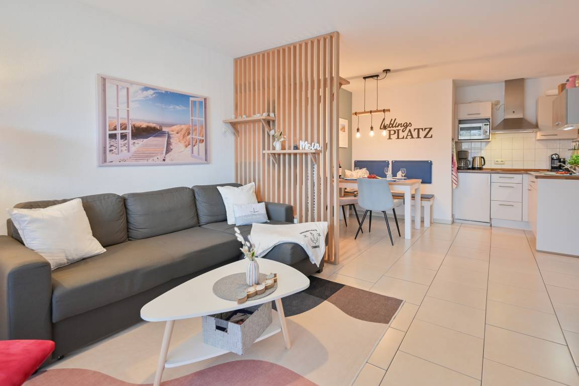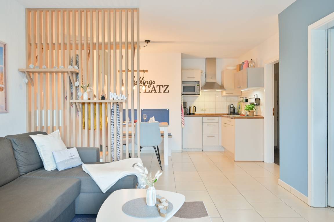 Ein beliebter Rückzugsort für alle: Diese Ferienwohnung ist sowohl bei Paaren als auch bei Familien sehr beliebt. Der nahegelegene Strand ist schnell erreichbar, und das große Bett (180 cm Liegefläche, erweiterbar auf 340 cm) sorgt dafür, dass bis zu drei Kinder genügend Platz finden.