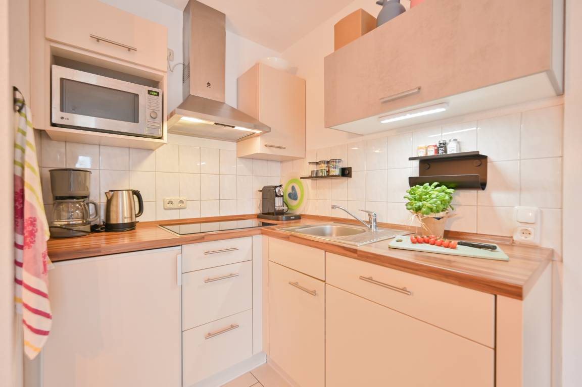 In der Küche finden Sie Mikrowelle, Geschirrspüler, eine Nespresso Maschine und einen Pürierstab (z.B. zur Zubereitung von Suppen oder Babykost). Update: Neue Küche ab April 2026!