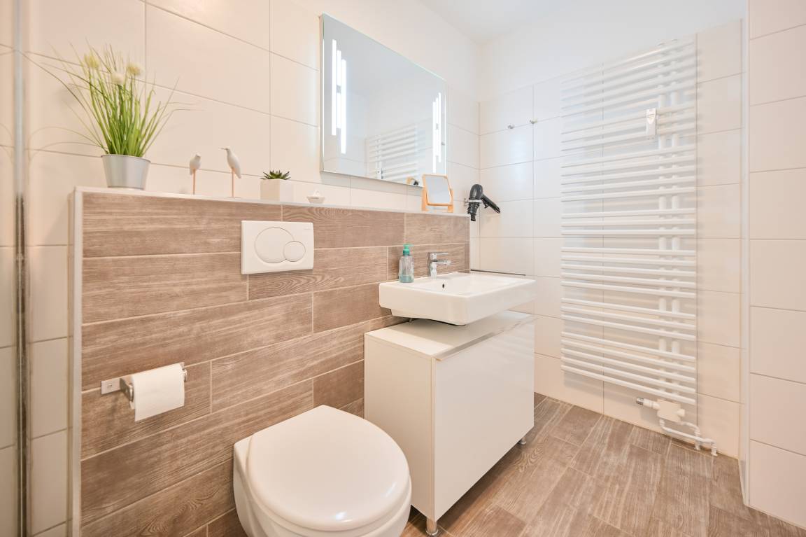 Das moderne Badezimmer mit Handtuchheizkörper macht schon morgens gute Laune. Ein Fön ist für Ihren Komfort vorhanden.